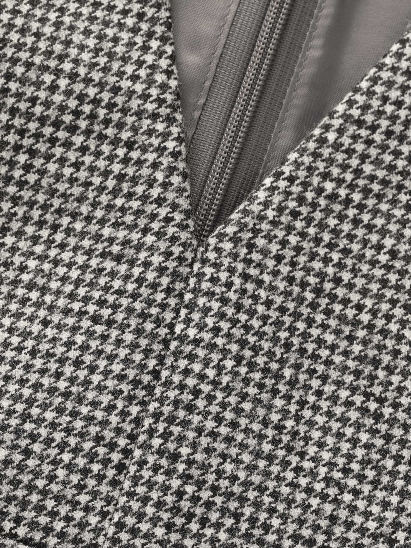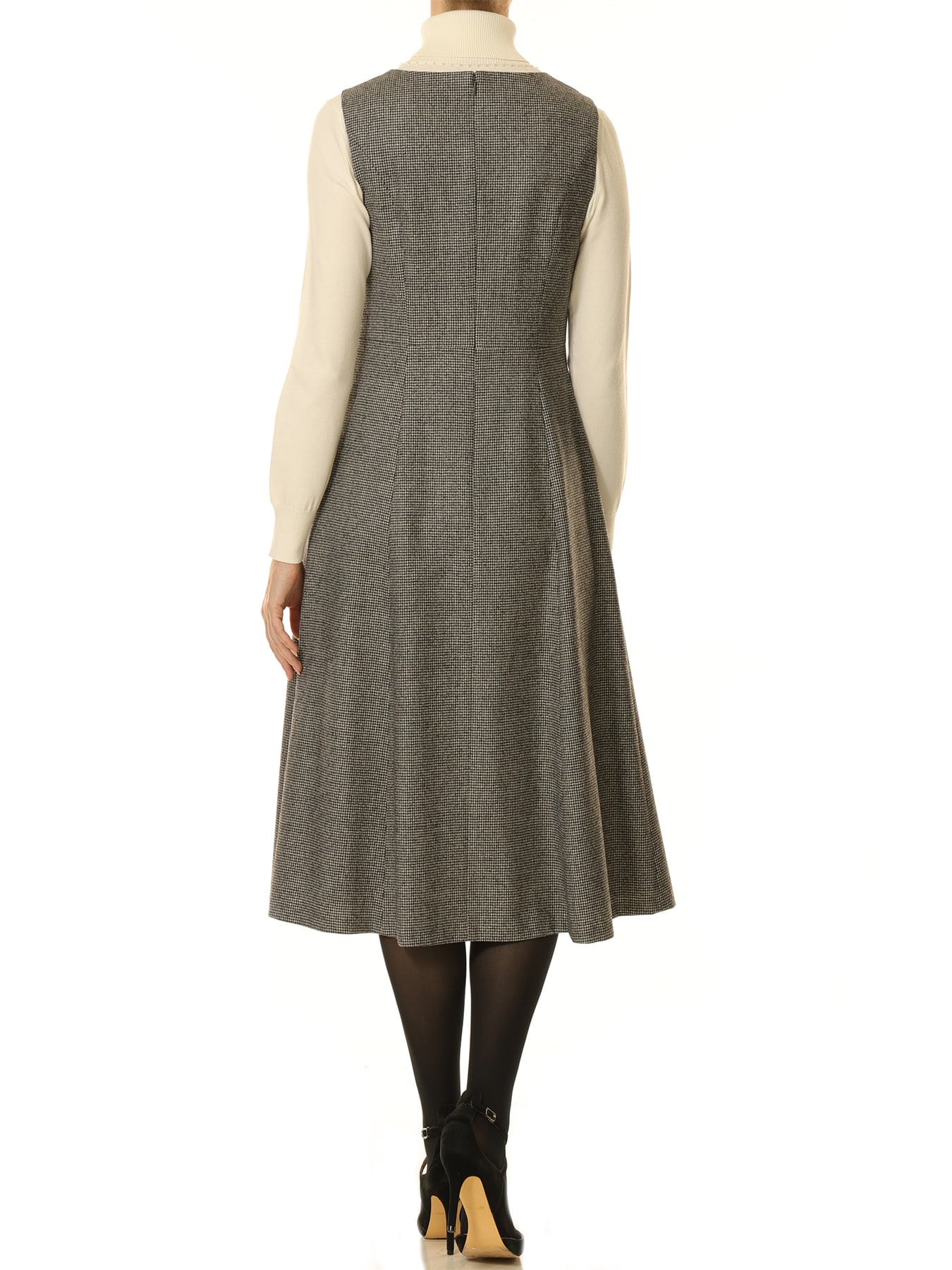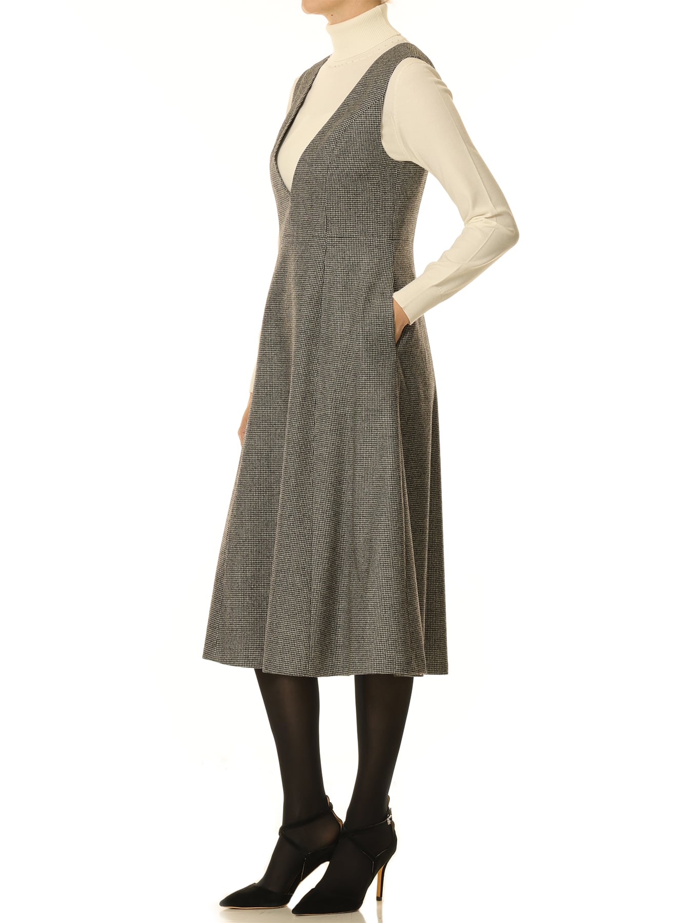 深いVネックがフェイスラインをすっきりと見せてくれるジャンパースカート。上半身をコンパクトに仕上げ、裾に向かって大きく広がるシルエットが女性らしい華やかさを演出します。クラシカルな千鳥格子柄と美しいシルエットの組み合わせが、洗練された印象を与えてくれます。インナーにはブラウスやニットを合わせて、シーンに応じたアレンジが可能。特に華やかなパーティーシーンやディナーには、パールアクセサリーやヒールを合わせれば、エレガントで特別感のあるスタイルに仕上がります。オンオフ問わず幅広く活躍する、大人の女性にふさわしい一枚です。 ・バックコンシールファスナー開き ・ポケットあり ・裏地あり ・ジャストフィット。通常サイズをお勧めします。 【お問い合わせ品番】 S946-011