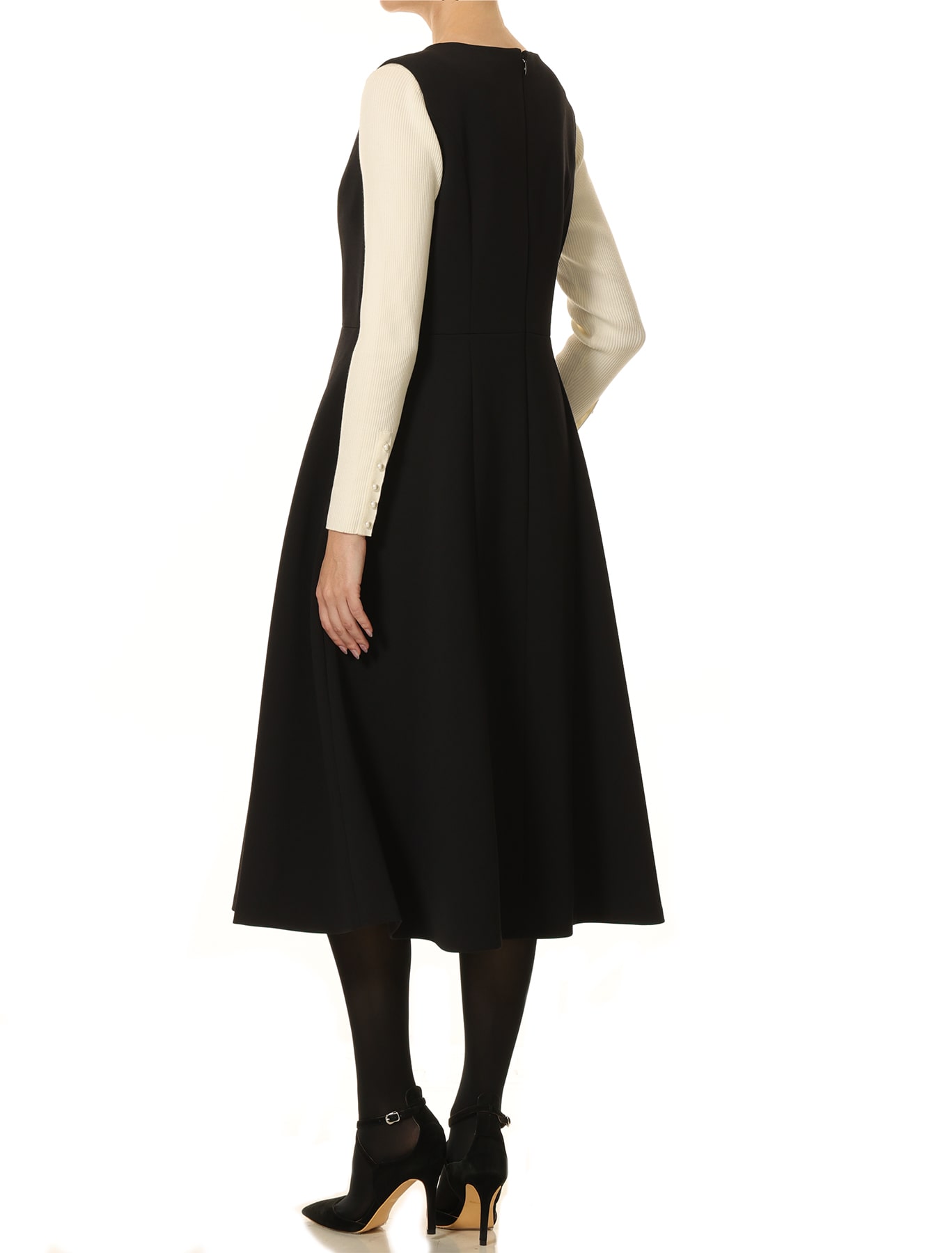 深いVネックがフェイスラインをすっきりと見せてくれるジャンパースカート。上半身はコンパクトに仕上げ、裾に向かって大きく広がる美しいシルエットが女性らしさを際立たせます。落ち感のある上品なジョーゼット素材を使用し、動くたびにしなやかな揺れ感が生まれるエレガントな一枚です。インナーにブラウスやニットを合わせれば、シーンに応じて多彩な着こなしが可能。特に華やかなパーティーシーンやフォーマルな場面では、パールやファーアイテムを添えていただくことで、洗練されたエレガントなスタイルが完成します。デイリーにもドレスアップにも対応できる、汎用性の高いアイテムです。 ・バックコンシールファスナー開き ・ポケットあり ・裏地あり ・ジャストフィット。通常サイズをお勧めします。 【お問い合わせ品番】 S946-012