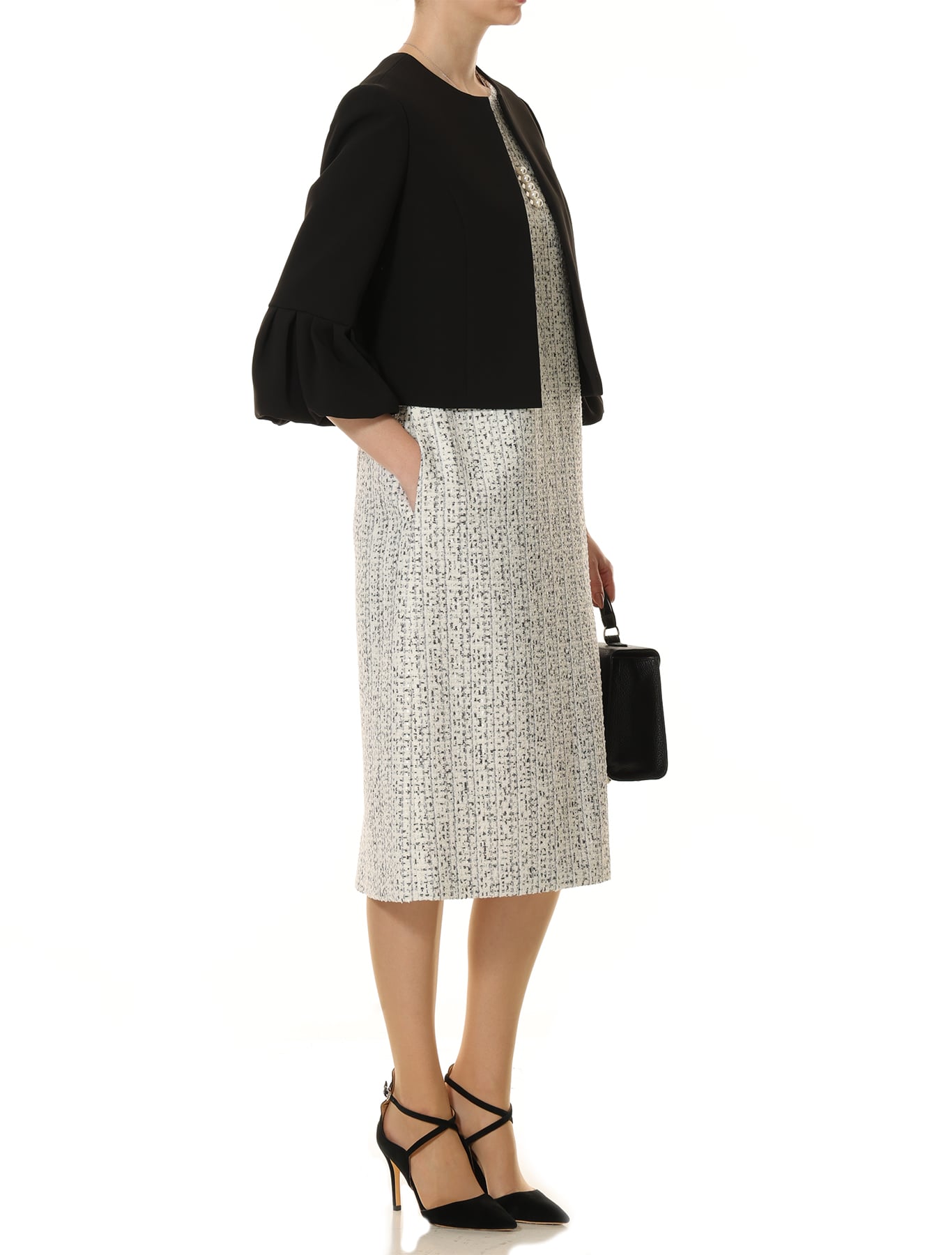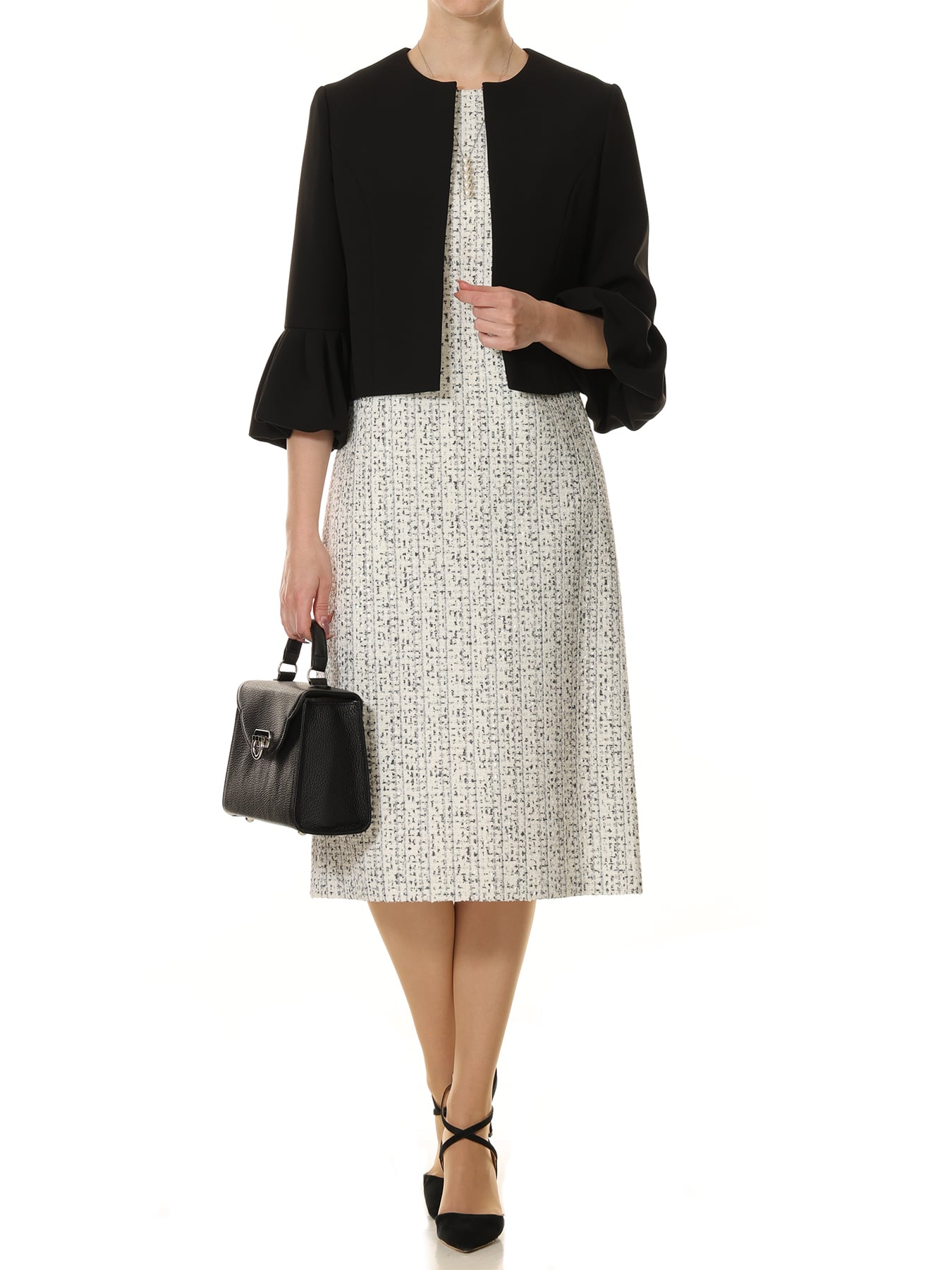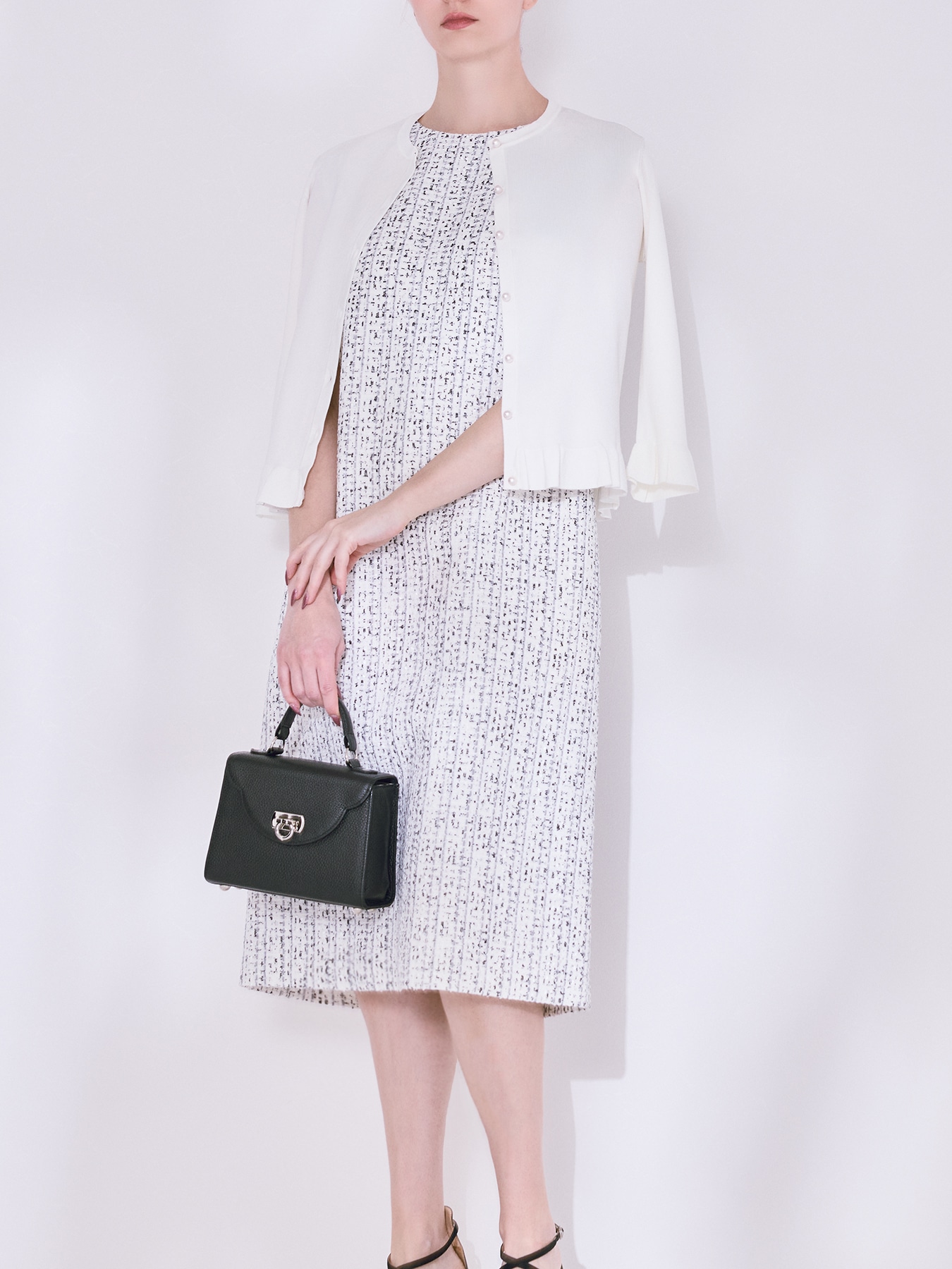 エレガントな佇まいを引き立てる、WHITE×BLACKのツイードを使用した上質なオーラを纏うノースリーブワンピース。国産のAVENIRETOILEオリジナルツイード生地を使用した他にはない贅沢な一着です。細やかな糸使いが生み出す奥行きのある表面感が、シンプルなシルエットに上質感と華やぎを添え、装い全体を洗練された印象へと導きます。身体のラインを拾いすぎないストレートシルエットにより、きちんと感がありながらも軽やかにお召しいただける一着に仕上げました。バックスタイルにはスリットを施し、足さばきの良さとさりげない女性らしさをプラスしています。オンシーンでは、ノーカラージャケットやショート丈ジャケットを合わせることで、式典や会食、きちんと感が求められるお仕事シーンにも対応。足元はパンプスで端正にまとめると、より上品な印象が際立ちます。オフシーンには、柔らかなカーディガンやライトアウターを羽織り、フラットシューズやバレエシューズを合わせることで、程よく肩の力を抜いた大人のエレガントスタイルをお楽しみいただけます。一枚で着映えし、シーンに合わせた着こなしが広がる、ワードローブに加えたいツイードワンピースです。 ・オリジナルツイード ・裏地あり ・ポケットあり ・バックコンシールファスナー開き ・ジャストフィット。通常サイズをおすすめします。 【お問い合わせ品番】 S947-005