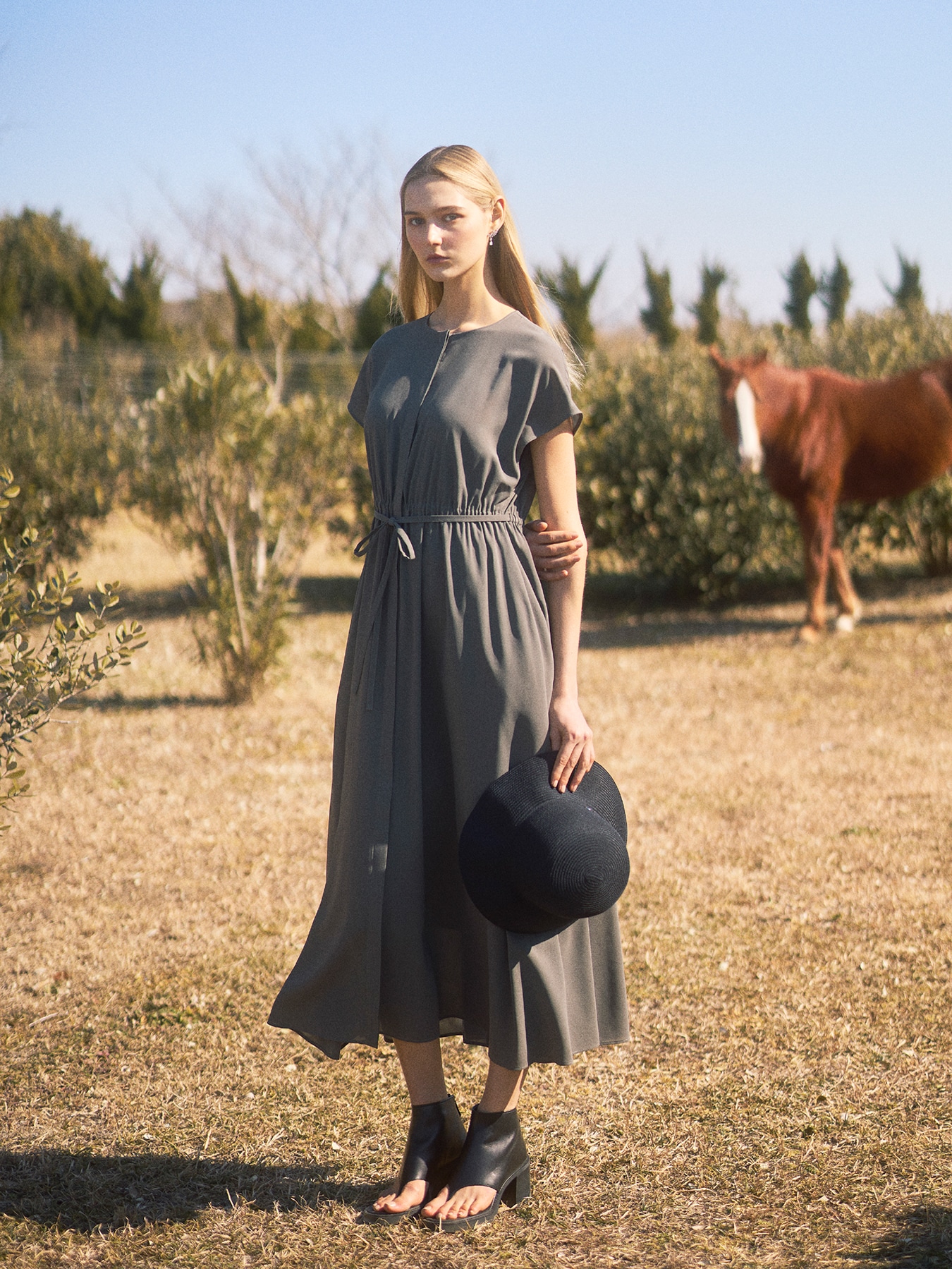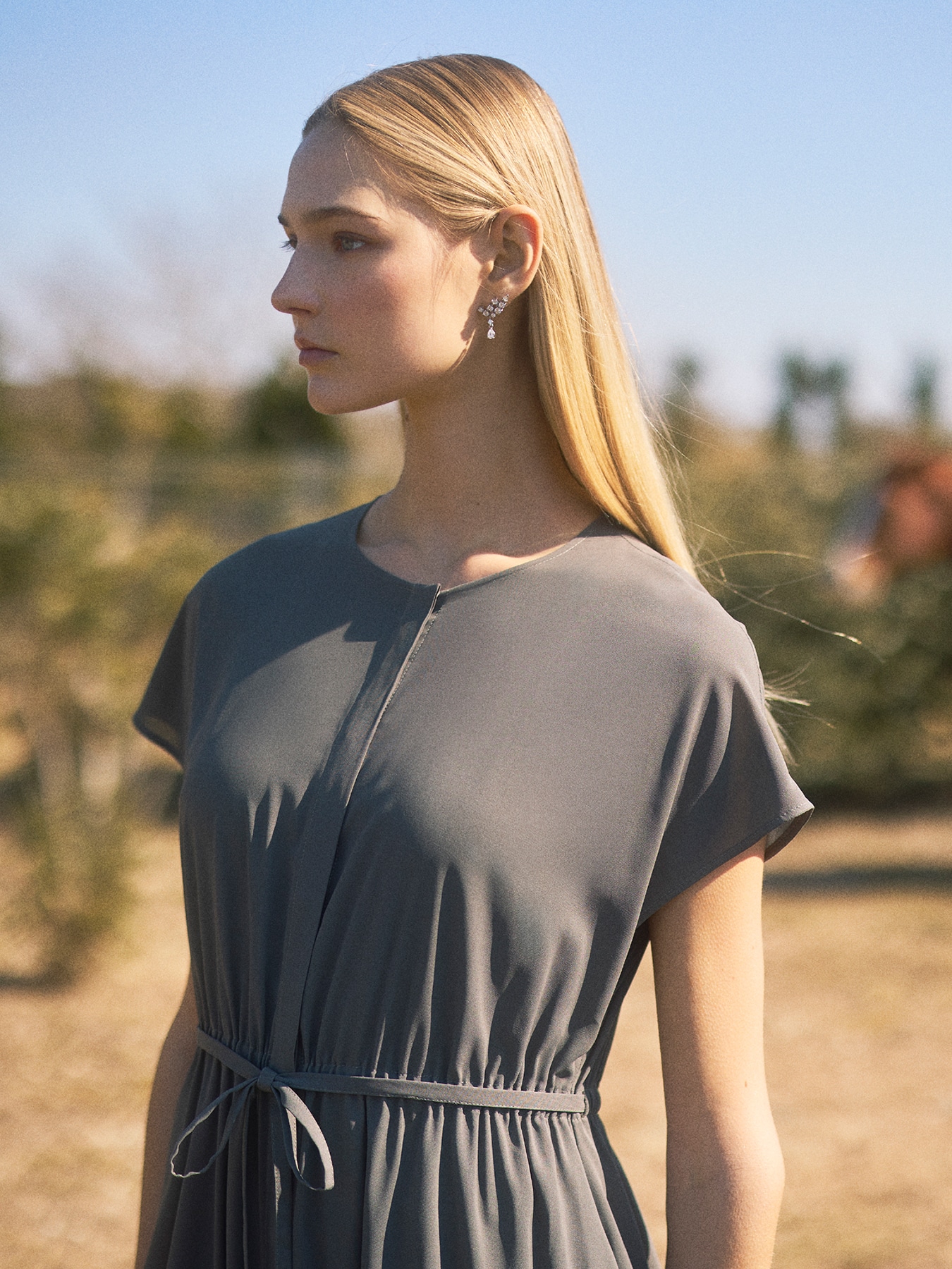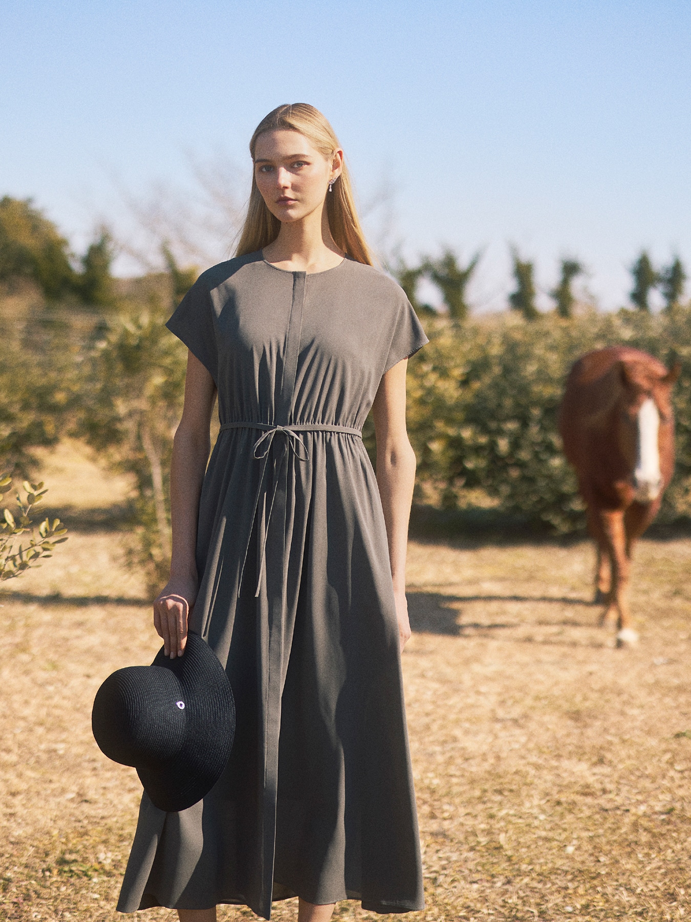 透け感のある軽やかなオーガンジー素材が、涼やかでエレガントな印象を纏うワンピース。空気を含んだようなエアリーな質感が、歩くたびに美しく揺れ、女性らしい柔らかな雰囲気を引き立てます。フロントは比翼ボタン開きにすることで縦のラインを強調し、すっきりとした洗練された印象に。ウエストにはゴムを配し、共布のリボンでシルエットにメリハリを生み出すことで、自然なスタイルアップを叶えます。素材には、空気層構造によって水滴が表面を転がるように滑落する優れた撥水性を備えた機能素材を採用。肌離れの良いさらりとした着心地で、湿度の高い梅雨時期や、汗をよくかく夏も快適にお召しいただけます。加えて適度なストレッチ性と、表面の微細な凹凸がもたらすナチュラルな風合いが、見た目の上質感と実用性を兼ね備えています。デイリーシーンには、フラットサンダルや軽やかなバッグを合わせて、リラックス感のある上品なカジュアルスタイルに。ウエストリボンを軽く結ぶことで、抜け感のあるシルエットもお楽しみいただけます。通勤やきちんとしたシーンには、カーディガンやジャケットを羽織ることで、端正で女性らしい印象に。縦のラインが強調されるデザインが、すっきりとした着こなしを叶えます。お出かけやリゾートシーンには、ヒールサンダルやアクセサリーをプラスして、より華やかに。軽やかな素材感と揺れ感が、シンプルながらも印象的なスタイリングを完成させてくれる一着です。 ・ご家庭で手洗い可能 ・撥水加工素材 ・表地透け感あり ・フロント比翼ボタン開き ・インナーキャミソールワンピース付属 ・ポケットあり ・スチーム可能ですが、過度なスチームを当てることにより、水分を多く含んでしまうと縮みや波打ちが発生しやすくなりますのでご注意ください。 ・ジャストフィット。通常サイズをお勧めします。 ・モデル身長171cm/バスト82cm/ウエスト60cm/ヒップ88cm/38サイズ着用 【お問い合わせ品番】 S947-007