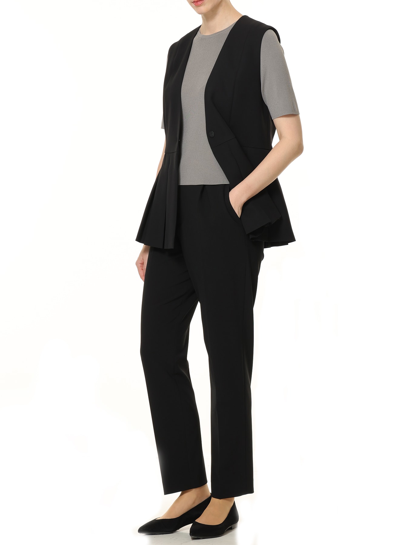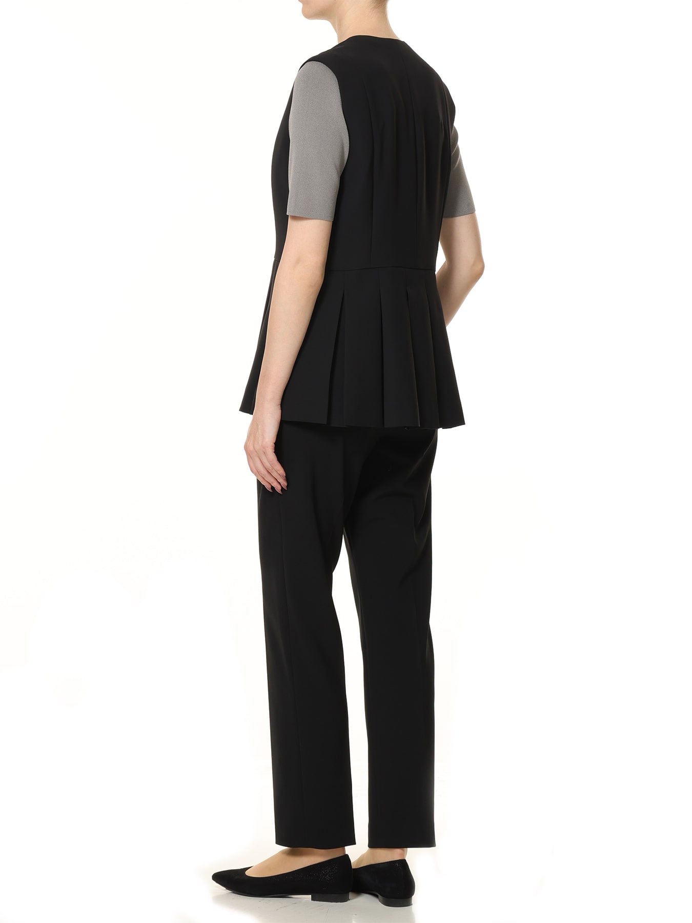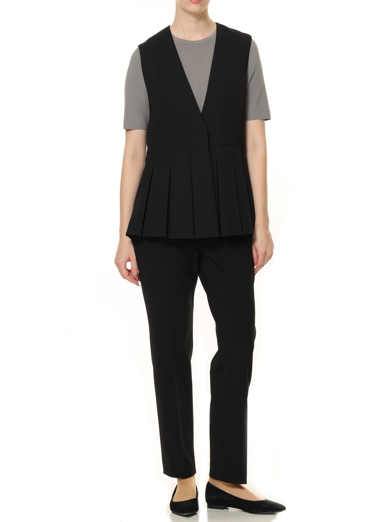 シャープな印象を与える深めのVネックが、顔まわりをすっきりと見せてくれるジレ。無駄を削ぎ落としたミニマルな上身頃から、裾にかけて広がるプリーツ仕立てのペプラムが立体的なシルエットを描き、エレガントさとモード感を併せ持つ一着に仕上げました。ウエスト位置で切り替えることで自然とスタイルアップを叶え、動くたびに揺れるプリーツが洗練された存在感を放ちます。きちんと感を求められるシーンでは、細身のテーパードパンツなど同系色のパンツと合わせてセットアップ風にまとめることで、凛とした佇まいに。インナーにコンパクトなニットやブラウスを重ねれば、より端正で都会的な印象が高まります。デイリーには、シンプルなカットソーやハイゲージニットに重ね、パンツやナロースカートと合わせることで、程よい抜け感のあるモードスタイルに。合わせるアイテム次第で表情を変え、オンオフ問わず活躍する主役級ジレです。 ・裏地あり ・フロントスナップボタン開き ・ジャストフィット。通常サイズをおすすめします。 ・モデル身長171cm/バスト82cm/ウエスト60cm/ヒップ88cm/Mサイズ着用 【お問い合わせ品番】 U147-006