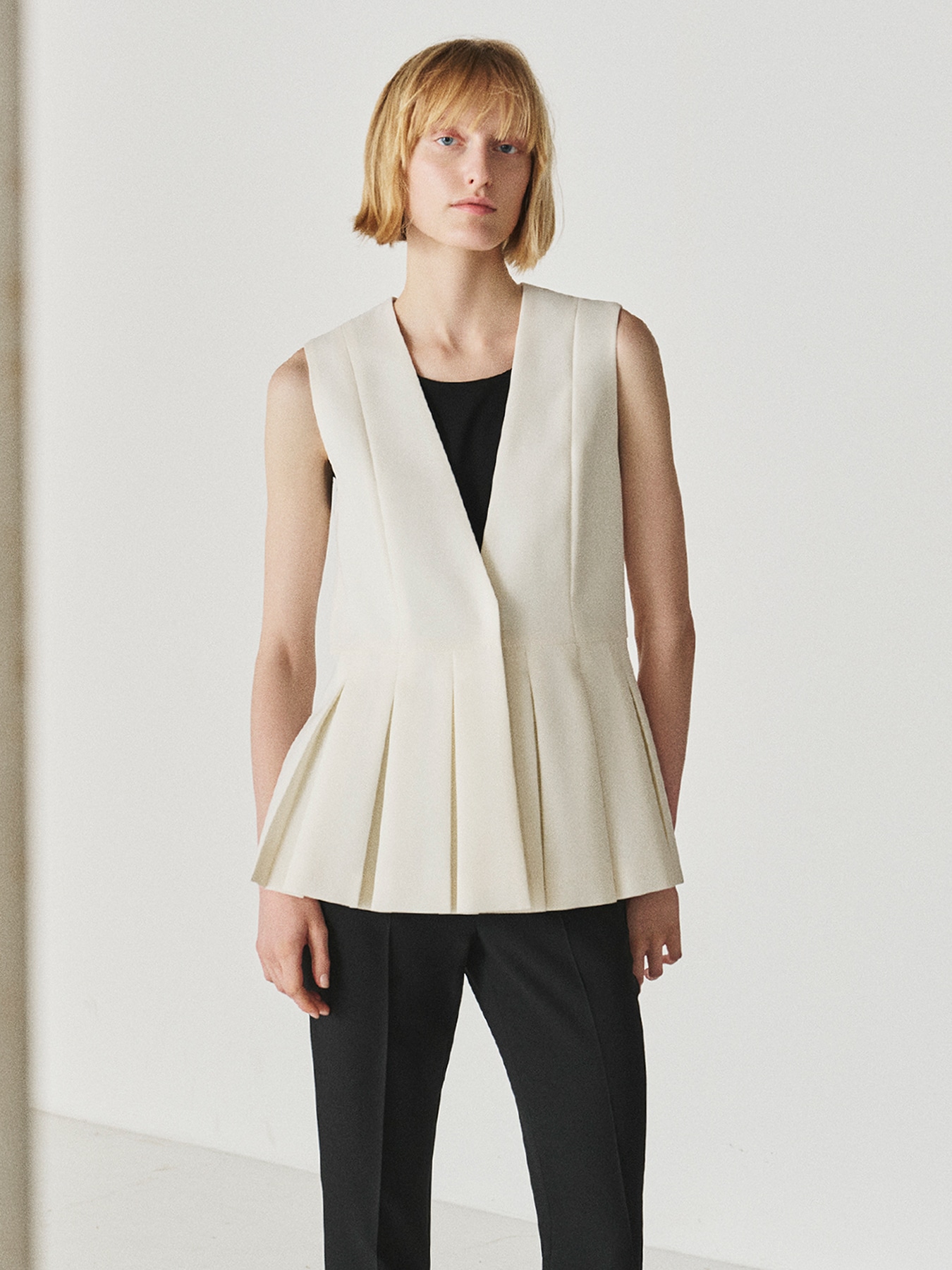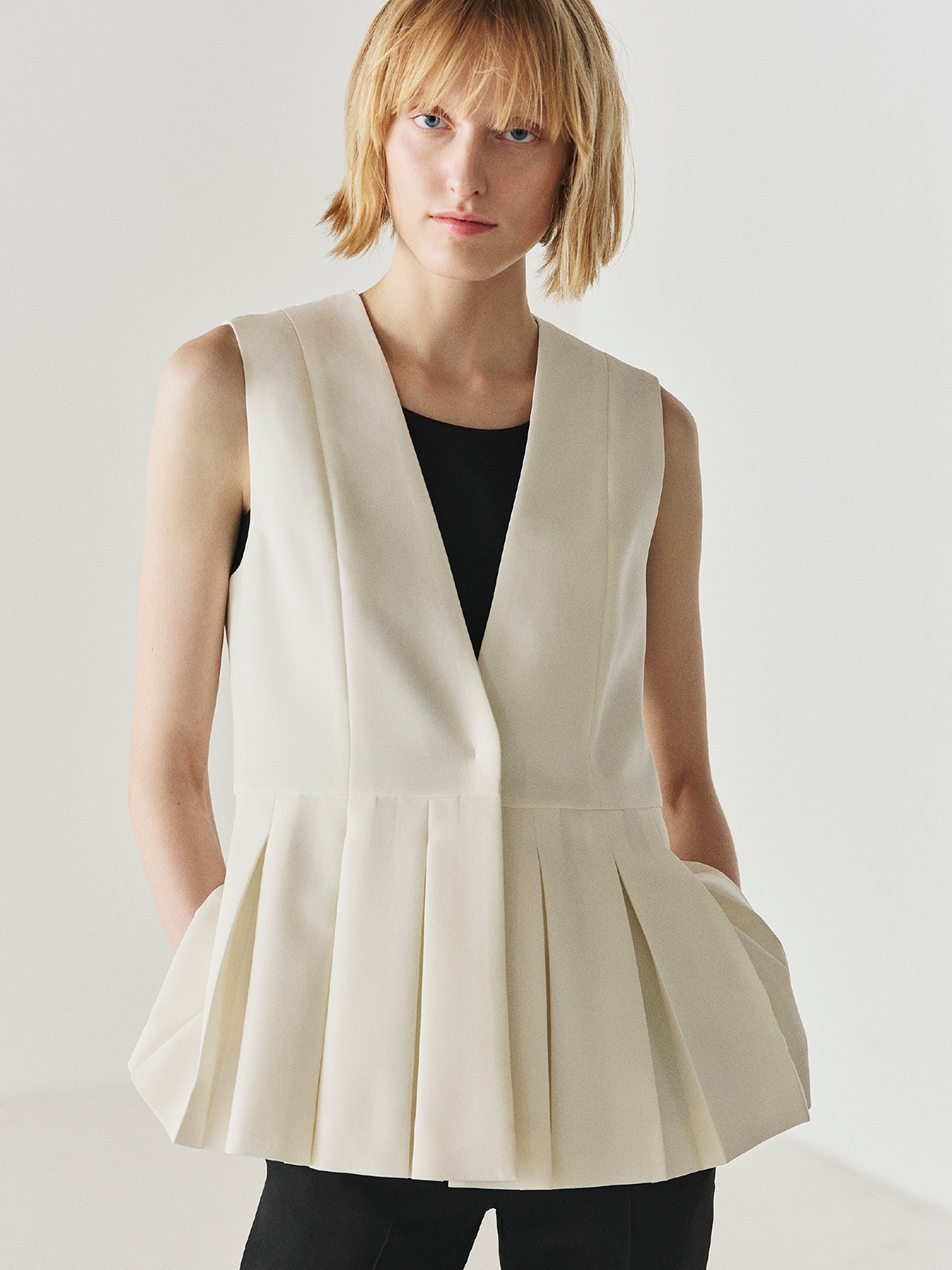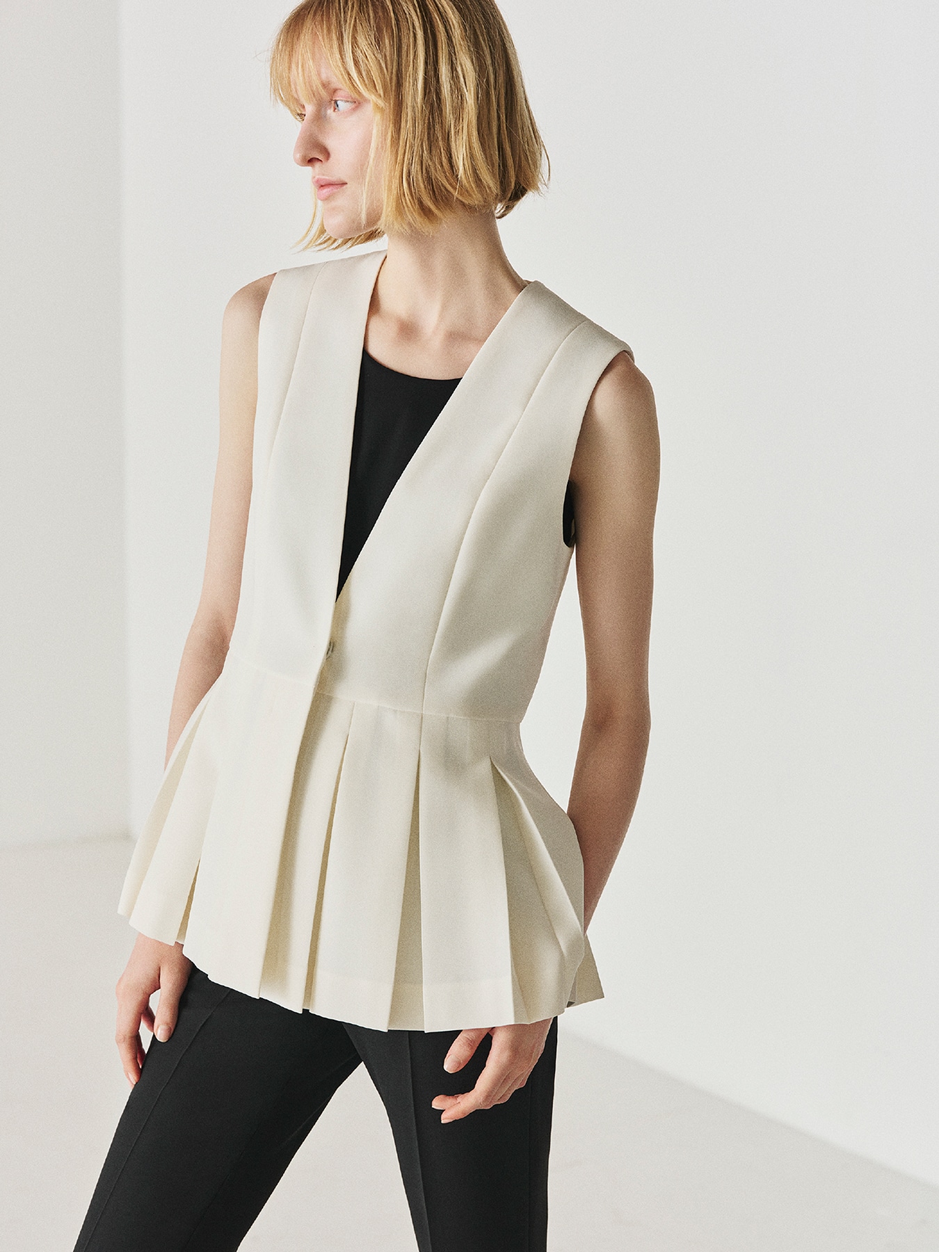 シャープな印象を与える深めのVネックが、顔まわりをすっきりと見せてくれるジレ。無駄を削ぎ落としたミニマルな上身頃から、裾にかけて広がるプリーツ仕立てのペプラムが立体的なシルエットを描き、エレガントさとモード感を併せ持つ一着に仕上げました。ウエスト位置で切り替えることで自然とスタイルアップを叶え、動くたびに揺れるプリーツが洗練された存在感を放ちます。きちんと感を求められるシーンでは、細身のテーパードパンツなど同系色のパンツと合わせてセットアップ風にまとめることで、凛とした佇まいに。インナーにコンパクトなニットやブラウスを重ねれば、より端正で都会的な印象が高まります。デイリーには、シンプルなカットソーやハイゲージニットに重ね、パンツやナロースカートと合わせることで、程よい抜け感のあるモードスタイルに。合わせるアイテム次第で表情を変え、オンオフ問わず活躍する主役級ジレです。 ・裏地あり ・フロントスナップボタン開き ・ジャストフィット。通常サイズをおすすめします。 ・モデル身長171cm/バスト82cm/ウエスト60cm/ヒップ88cm/Mサイズ着用 【お問い合わせ品番】 U147-006