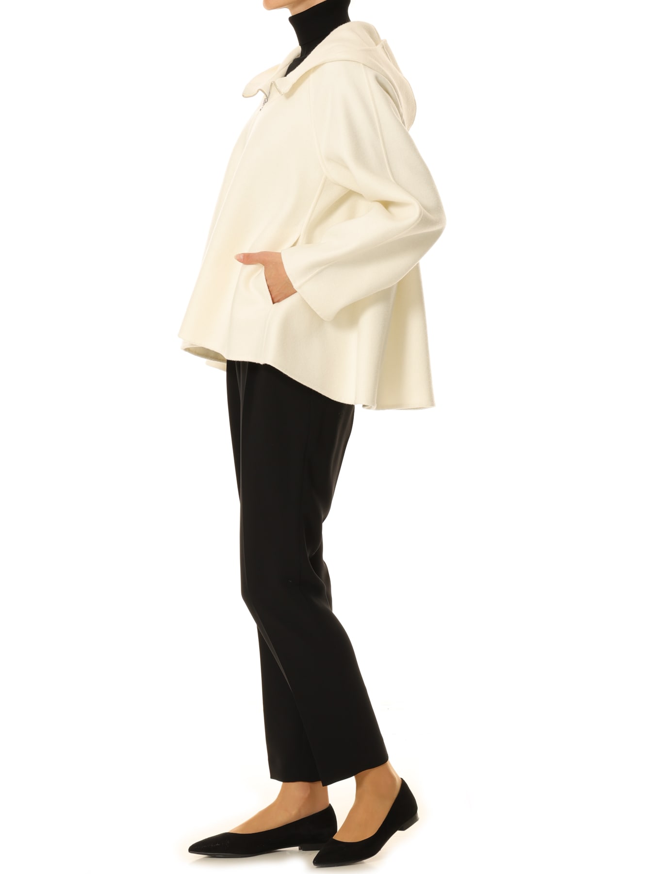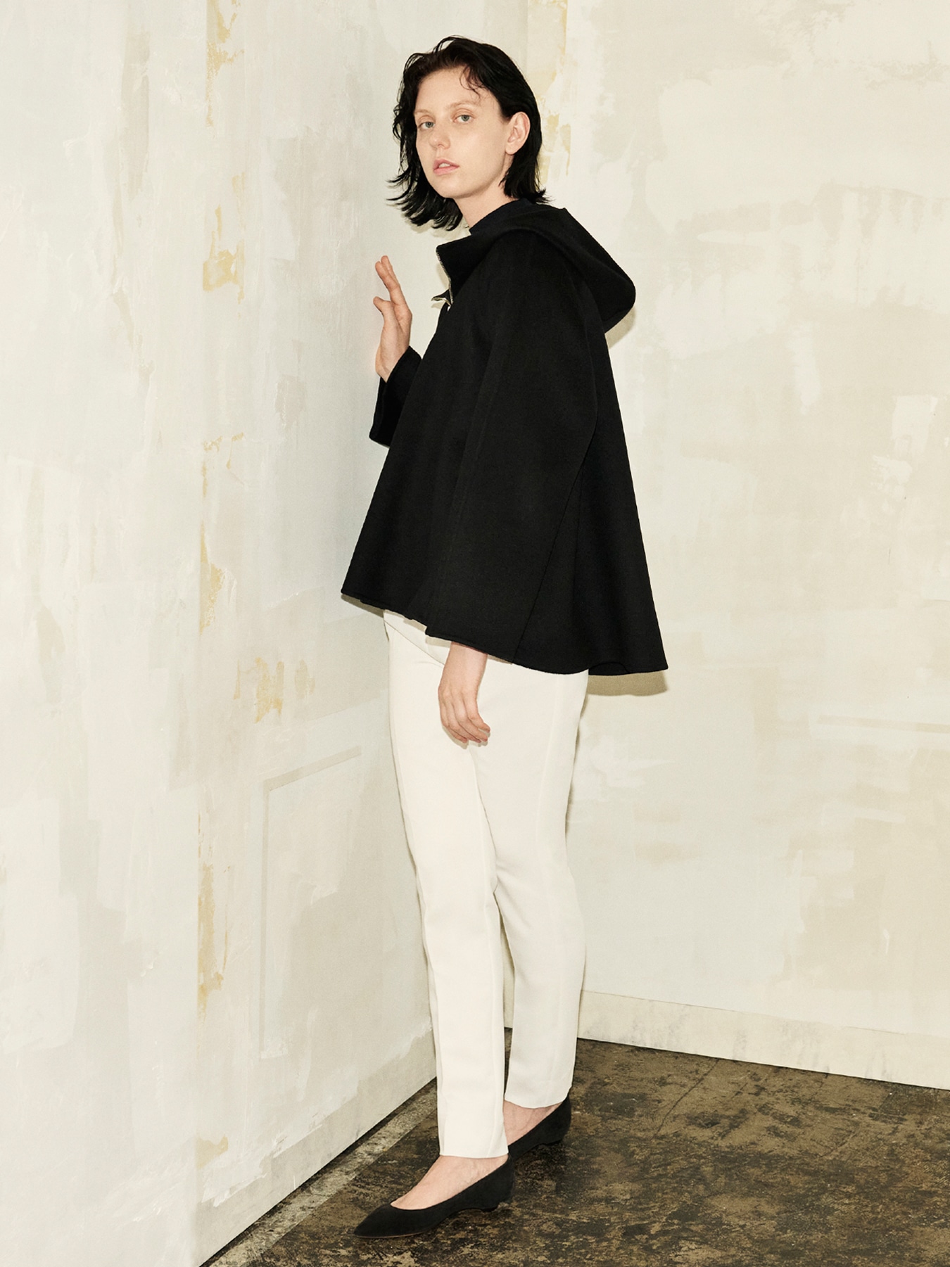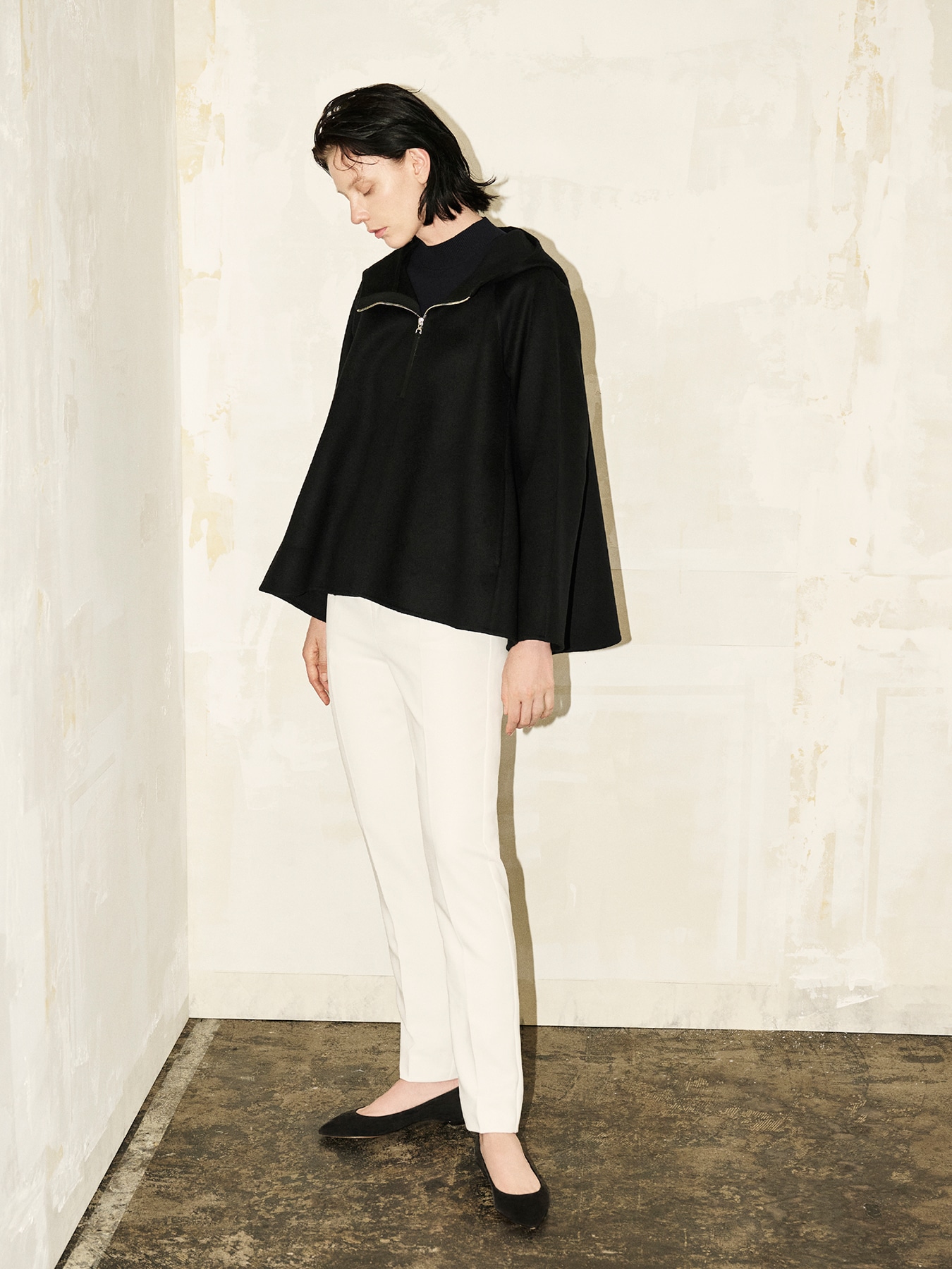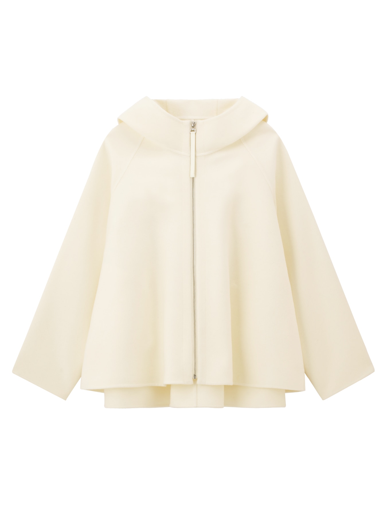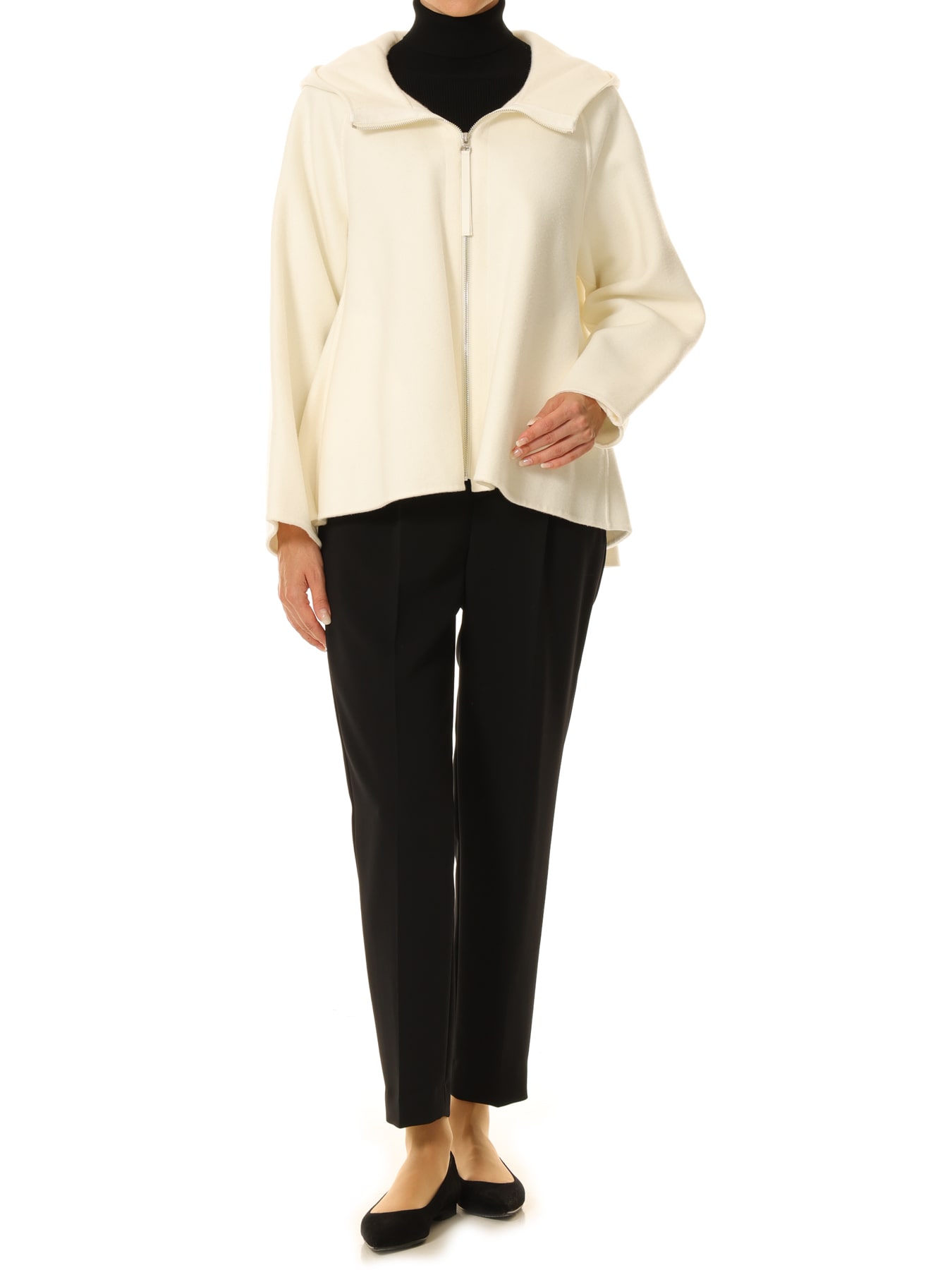 エレガント見えが叶うフレアデザインとフーディがポイントのジップアップジャケット。バックスタイルにタックを施すことで立体的なシルエットが生まれ、カジュアルになりがちなフーディジャケットを品よくまとめ上げてくれます。ジッパーは開き具合によって表情が変わり、トップまで閉じていただくとスタイリッシュにお召いただけ、途中まで閉じて大きめの襟を作っていただくのもお勧めで小顔効果が叶います。ファスナー裏のグログランテープは前を開けて着た時のさりげないアクセントになります。1枚仕立てのリバー素材によって軽い着心地が魅力。ボトムはレギンスやタイトなテーパードパンツなどと合わせてコンパクトにまとめていただくと、バランスよくお召いただけます。 ・フロント金属ファスナー開き ・両脇シームポケットあり ・裏地なしのリバーデザイン ・ゆとりのあるフィット。通常サイズをお勧めします。 ・重量約910g ・(OFF WHITE)モデル身長171cm/バスト82cm/ウエスト60cm/ヒップ88cm/36サイズ着用 【お問い合わせ品番】 OFF WHITE:U243-002 BLACK:U243-003