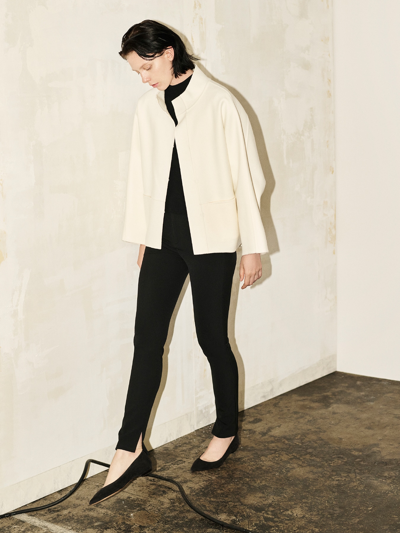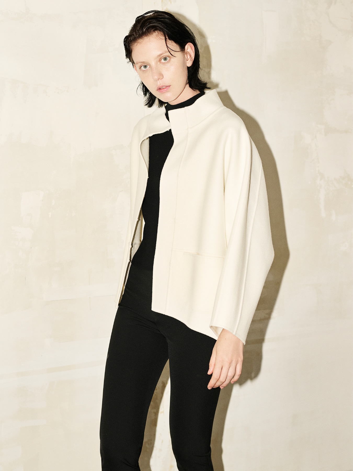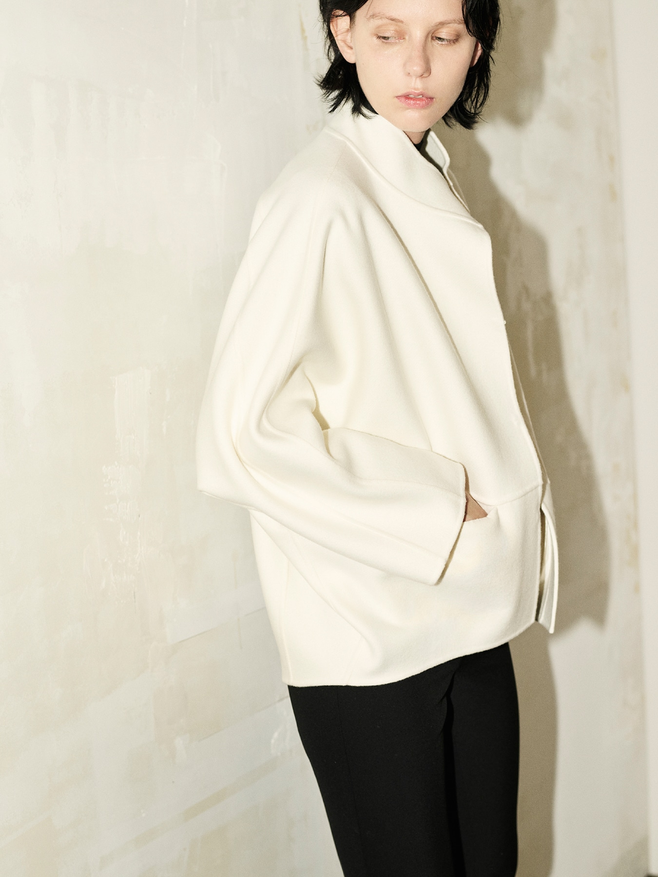 小顔効果や華奢見えが叶うオフネックラインとドルマン調のスリーブがポイントになった、コクーンシルエットのコート。ゆったりとしたシルエットはストレスフリーな着心地で、ボリュームスリーブやニットなど合わせるアイテムを選ばず、コーディネートの幅が広がります。前後差のあるヒップが隠れる程の丈感は、気になるボディラインをカバーしてくれるのが嬉しいところ。切替ラインに施されたシームポケットや、フロントのホック開きが身頃デザインをシンプルにまとめミニマルに。柔らかく滑らかな肌触りが魅力のリバー素材が抜群の着心地を与えてくれます。1枚仕立てのリバー縫製によって軽量感が嬉しいコートです。 ・フロントホック開き ・フロント切替シームポケットあり ・淡色はやや透け感あり ・ゆとりのあるフィット。通常サイズをお勧めします。 ・重量約800g ・(BLACK)モデル身長171cm/バスト82cm/ウエスト60cm/ヒップ88cm/Sサイズ着用 【お問い合わせ品番】 U243-010 OFF WHITEのみ:U243-011