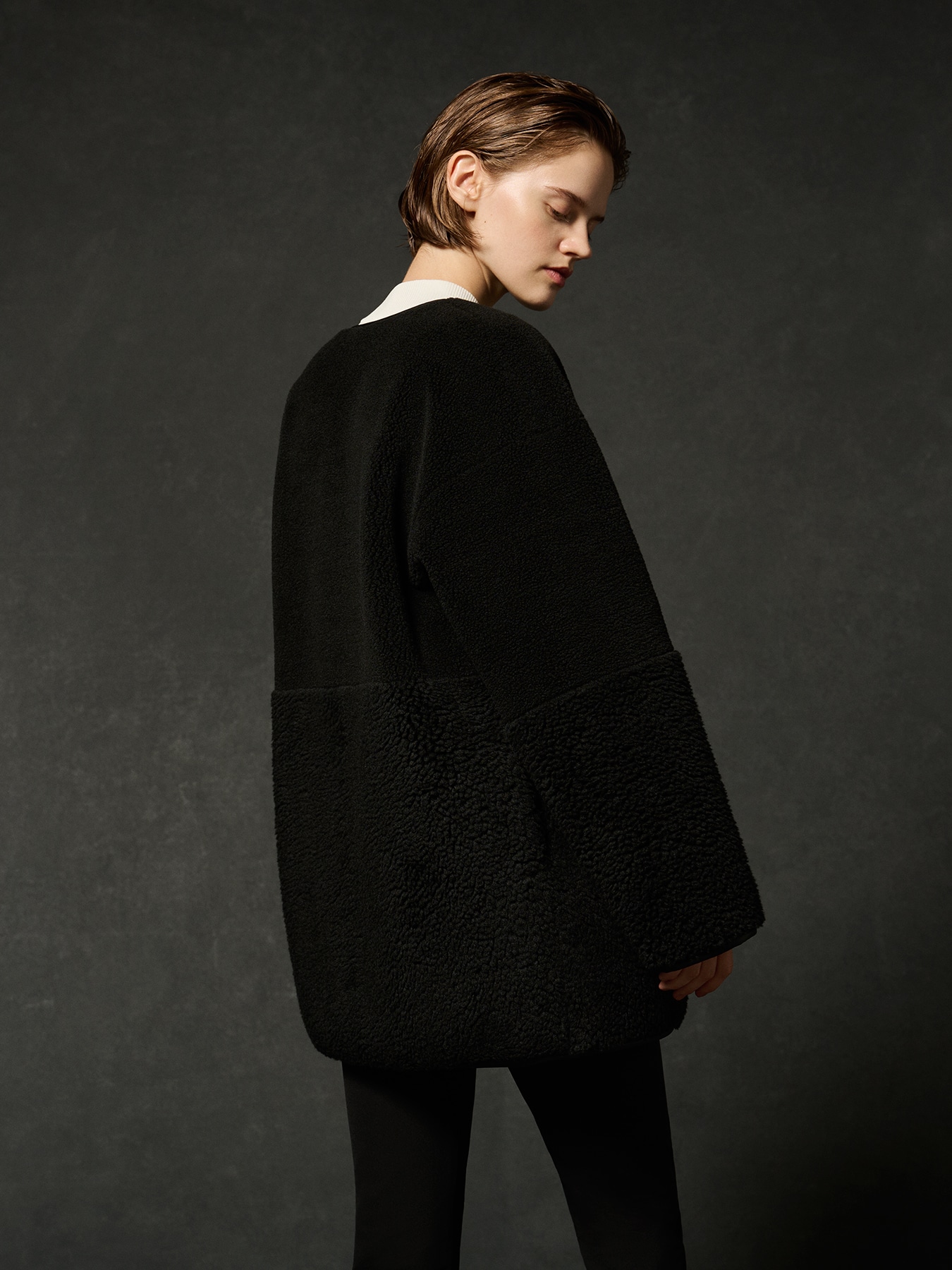 スタイリングに暖かみのある柔らかな表情を添えてくれるミドル丈のボアジャケット。ボリューム感の異なるボアを切り替えデザインにした暖かみのある印象のボア面と、滑らかな表面感が上質な印象をもたらすフェイクスウェード面のリバーシブルでお楽しみいただくことができます。襟ぐりから裾、袖口にはフェイクレザーのパイピングを施すことでモードなアクセントに。前開きにボタン等の無いすっきりとしたデザインで、シンプルなスタイルにさっと羽織るだけでこなれ感のあるエレガントスタイルを完成させてくれる一着です。 ・リバーシブルで着用可能 ・ポケットあり ・ややゆとりのあるフィット。通常サイズをおすすめします。 【お問い合わせ品番】 IVORY:U246-007 BLACK:U246-008