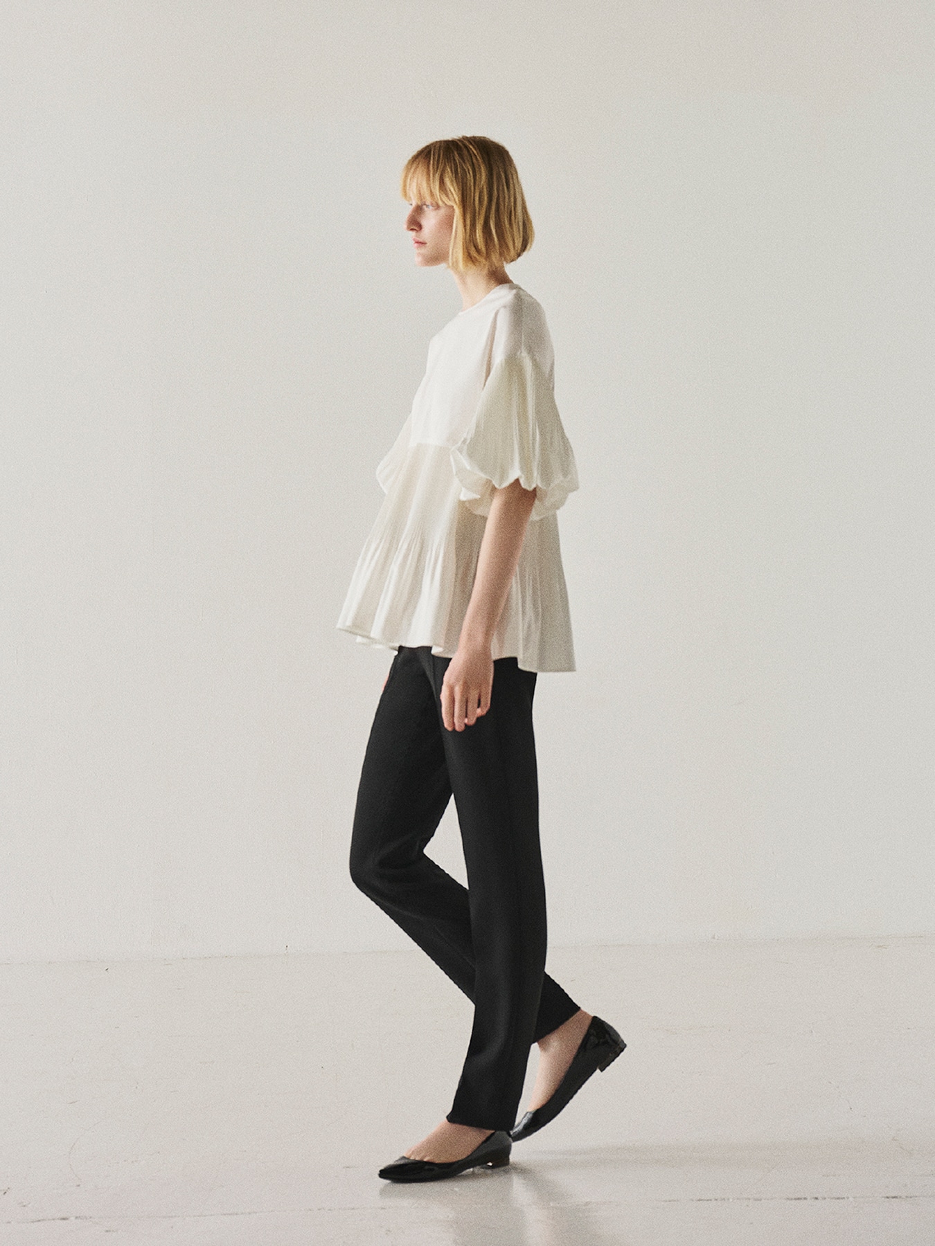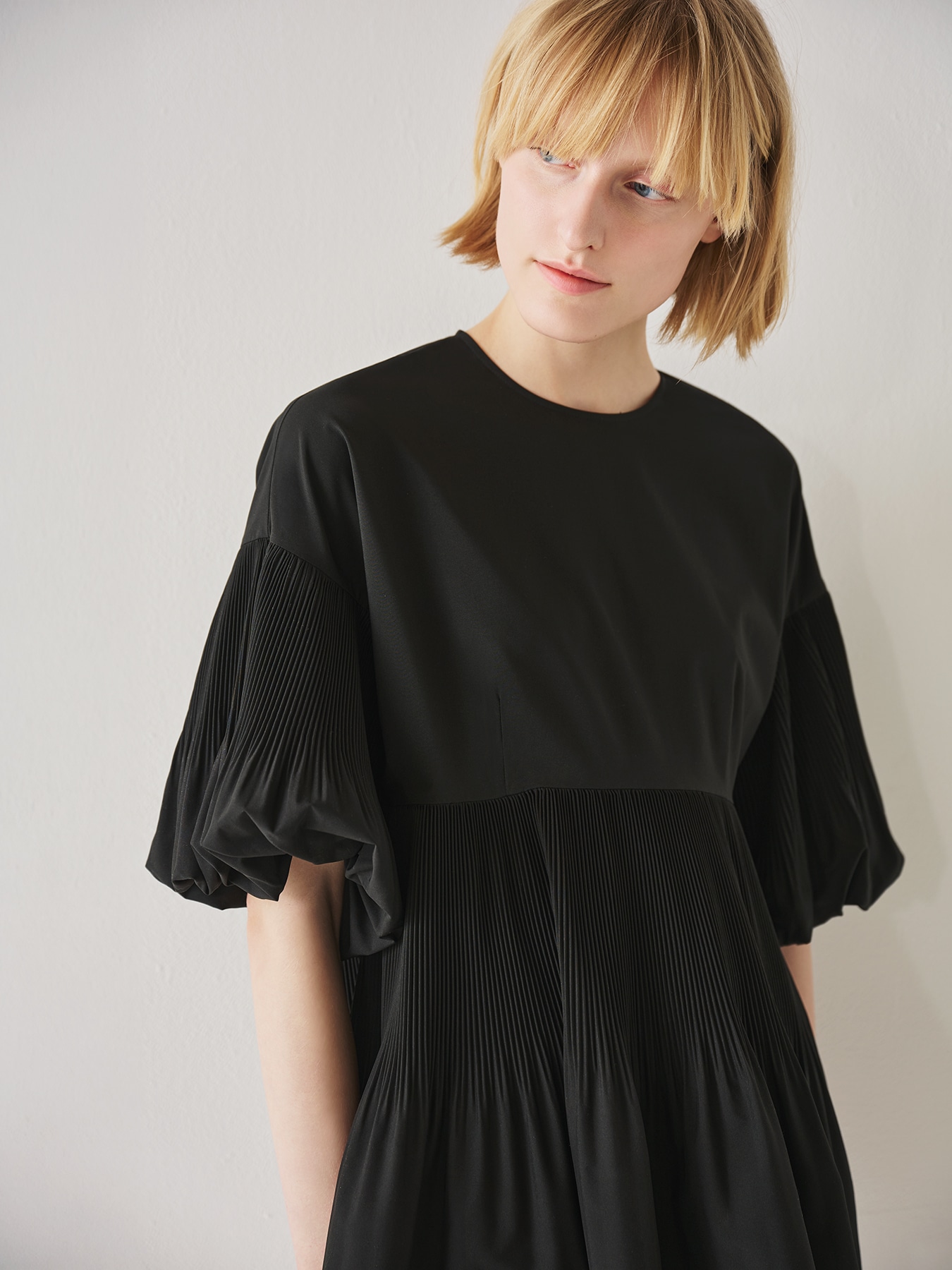 繊細なアコーディオンプリーツデザインと、ボリュームのあるバルーンスリーブによって華やぐオーラを纏うブラウス。ゆとりのあるボディラインも細かなプリーツによってすっきりとした雰囲気にまとまり、ふくらみのあるスリーブデザインは腕のラインを華奢に見せてくれます。滑らかな表面感と上品な光沢感を持つシルキータフタの素材によって、大人の女性らしく上品で洗練された雰囲気を醸します。ヒップにかかる長めの丈感ですっきりとしたパンツやレギンスともバランスよくお召しいただけます。襟ぐりはすっきりとしたクルーネックなのでアクセサリー使いも映え、幅広しシーンに活躍します。 ・ご家庭で手洗い可能 ・WHITEは透け感あり ・スチーム可能 ・ジャストフィット。通常サイズをお勧めします。 ・モデル身長171cm/バスト82cm/ウエスト60cm/ヒップ88cm/Mサイズ着用 【お問い合わせ品番】 U347-001