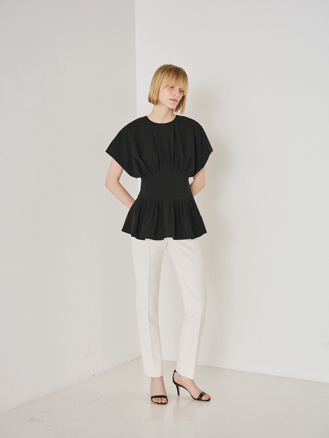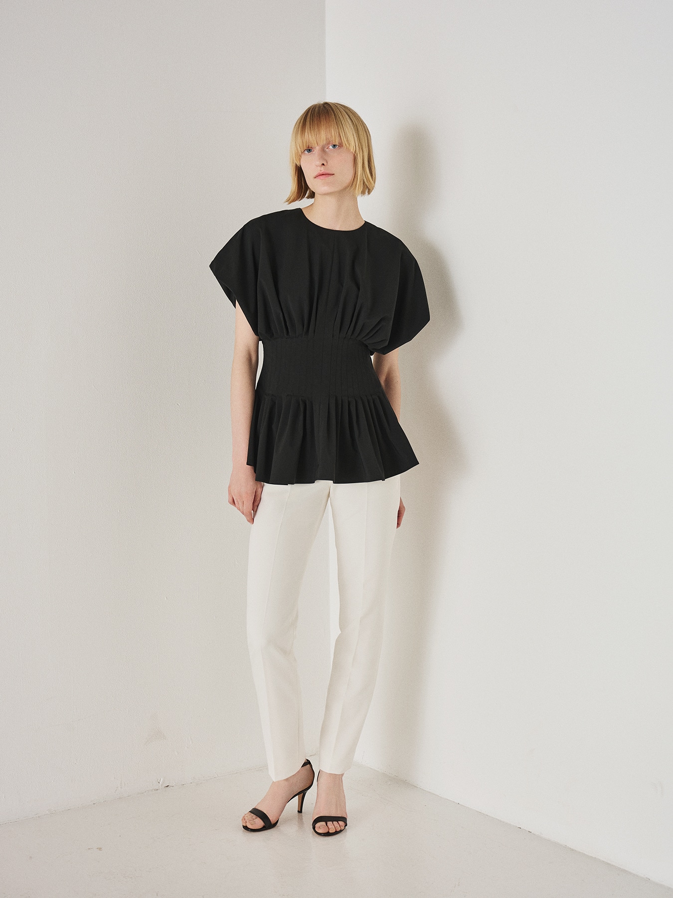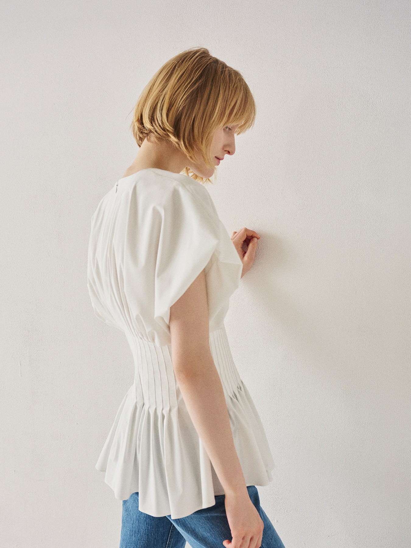 ウエストのタックシェイプのデザインがスタイルアップを叶えるブラウス。肩幅が目立ちにくく華奢見えが叶うスリーブデザインは、袖山に細かくギャザーを寄せた膨らみ感のあるパフスリーブ。暑くなる季節にも嬉しい吸水速乾性を備えた、柔らかく清涼感のあるタイプライターの素材感。程よいはり感のあるナチュラルな質感で、しわになりにくく透けにくいのも魅力の一つ。すっきりとしたテーパードパンツなどシンプルなボトムと合わせていただくだけで洗練されたスタイルが完成します。 ・ご家庭で手洗い可能 ・身頃上側のみ裏地あり ・バックコンシールファスナー開き ・WHITEは透け感あり ・スチーム可能 ・ジャストフィット。通常サイズをお勧めします。 ・モデル身長171cm/バスト82cm/ウエスト60cm/ヒップ88cm/Mサイズ着用 【お問い合わせ品番】 U347-002