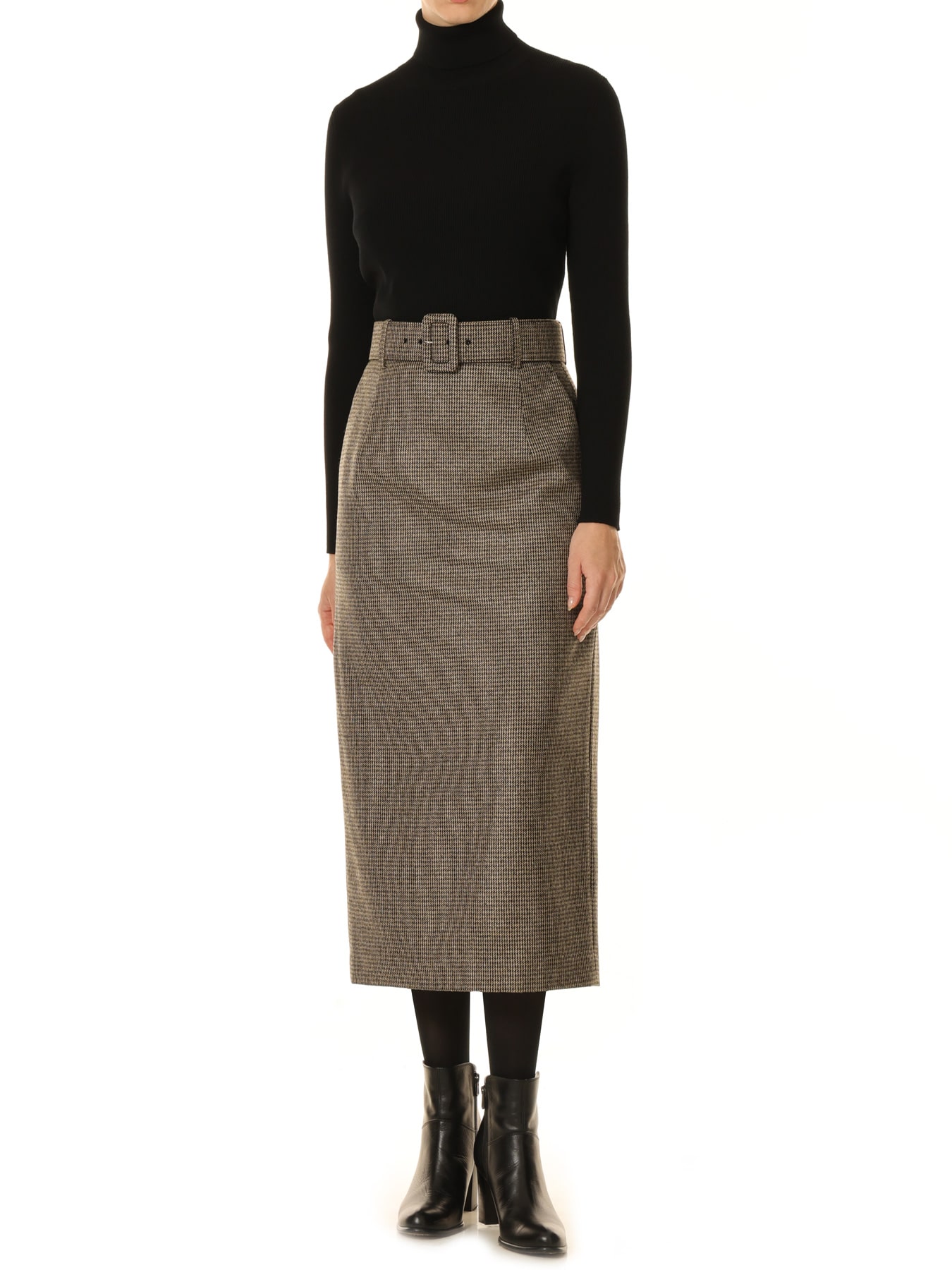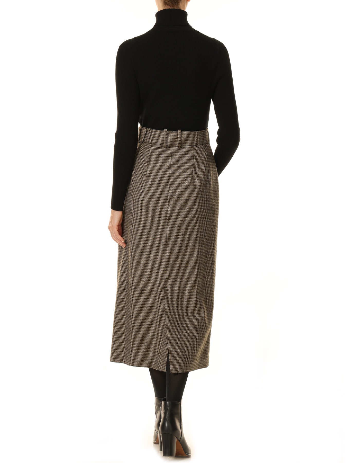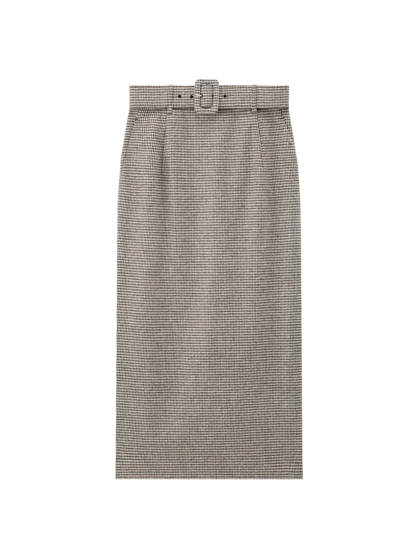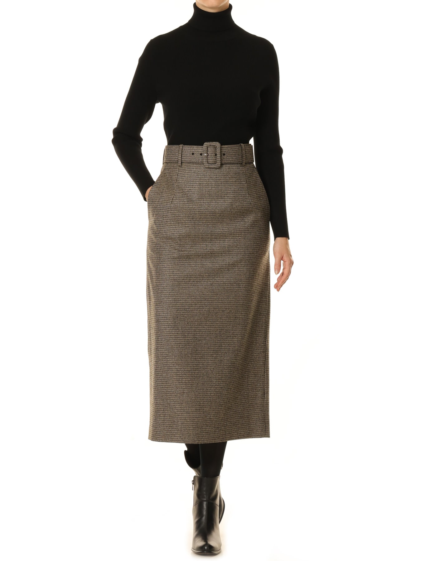 クラシカルなガンクラブチェック柄が、シーズンムードを高めるタイトスカート。すっきりとしたIラインシルエットに共布のベルトを配することで、ウエストを美しく引き立て、上品な女性らしさを演出します。バックにはベンツが施されているので足さばき良くお召しいただけます。上質なウール混素材が生み出す程よいハリ感と温もりのある表情で、オンスタイルにはタートルネックやジャケットを合わせてきちんと感を、オフスタイルにはニットやショートブーツを合わせてモードに。季節感と洗練を兼ね備えた、秋冬のワードローブに欠かせない一枚です。 ・ベルト取り外し可能 ・ポケットあり ・バックコンシールファスナー開き ・裏地あり ・ジャストフィット。通常サイズをお勧めします。 【お問い合わせ品番】 U446-013