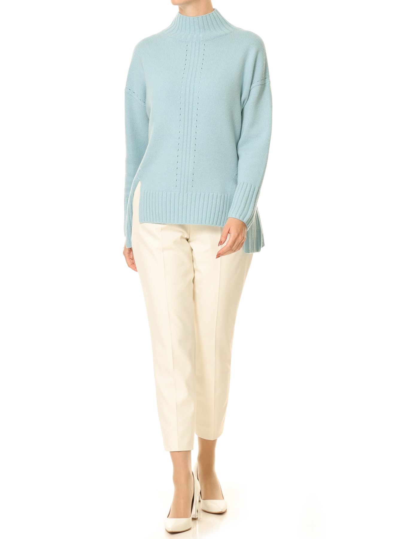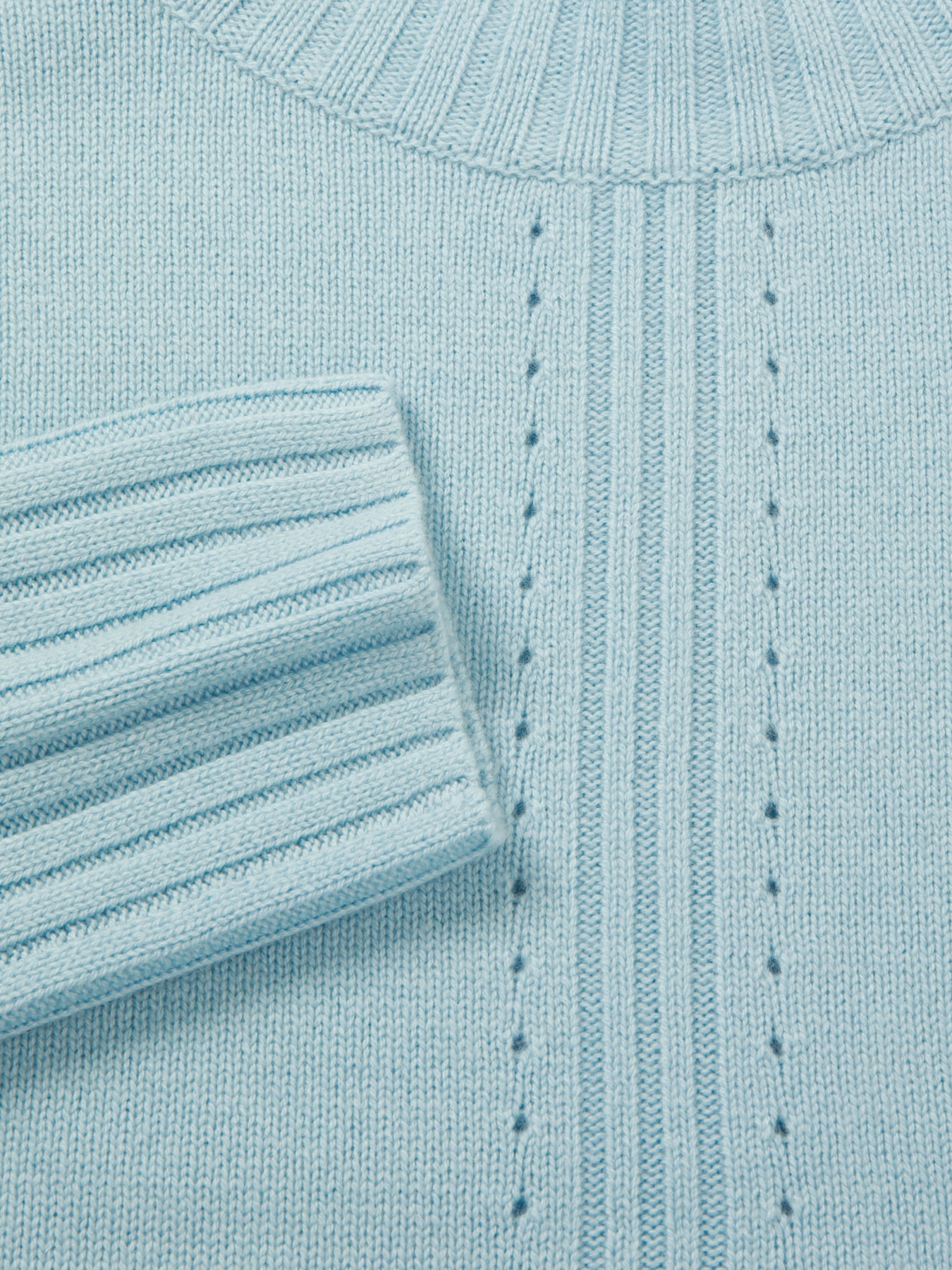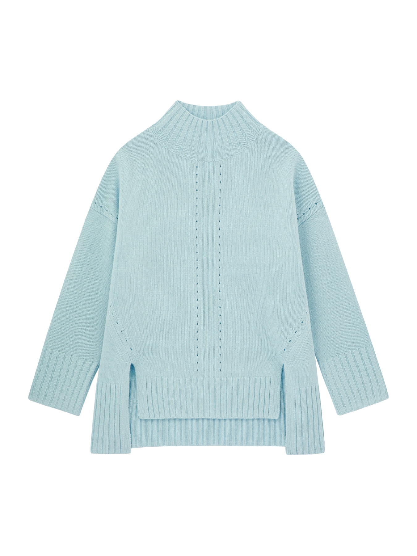 身頃中央と袖付部分の編みデザインによって、抜け感がプラスされたハイネックのニットプルオーバー。裾や袖口、首元のリブ編みと、身頃中央の縦のラインもポイントに。首に沿うハイネックはお顔回りをすっきりと魅せてくれ、ヒップを覆う程のやや長めの丈感にリラックス感漂うドロップショルダーは大人のこなれ感を演出します。カシミヤとウールブレンドの柔らかく保温性のある素材感もこれからの季節に嬉しいところ。インナーに長めのシャツを合わせてのレイヤードもお勧め。ボトムはタイトなアイテムと合わせてのコーディネートがバランスよくお召しいただけます。カラーバリエーション豊富なのでお気に入りのカラーを試してみるのもお勧めです。 ・編み模様部分は透け感あり ・ややゆとりのあるフィット。通常サイズをお勧めします。 ・モデル身長171cm/バスト82cm/ウエスト60cm/ヒップ88cm/Sサイズ着用 【お問い合わせ品番】 U741-018