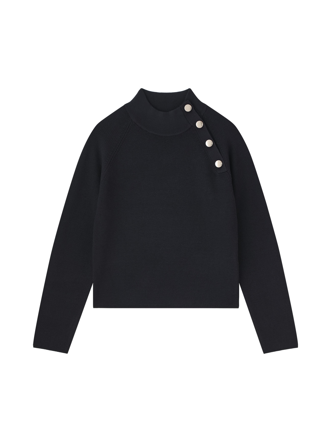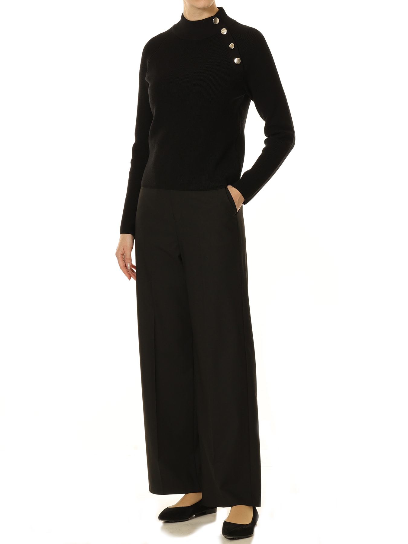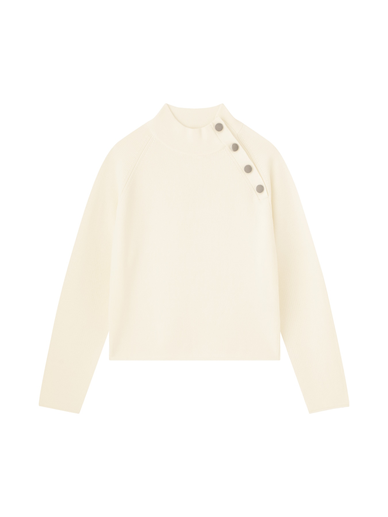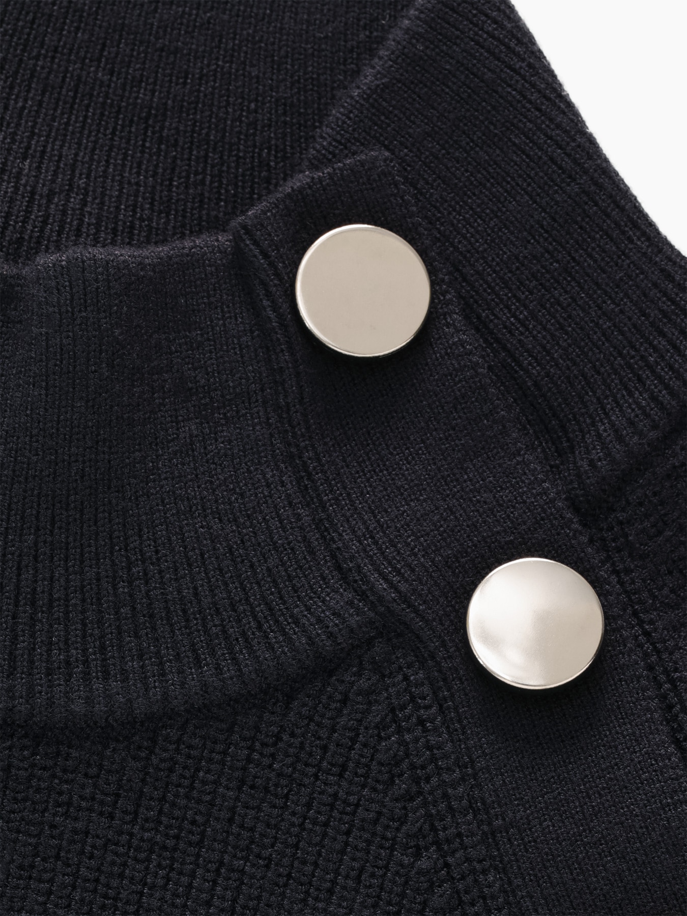 モードなエッジと上品さを兼ね備えた、主役級のニットプルオーバー。レーヨンをベースにした中厚手素材は、しなやかな落ち感とほんのりとしたハリがあり、身体のラインを拾いすぎずに美しく見せてくれます。左肩に並んだメタルの飾りボタンが洗練されたアクセントとなり、シンプルなスタイルにさりげなく個性を添える一枚です。オンスタイルには、タック入りのスラックスや細身のパンツを合わせて、クリーンで端正なムードに仕上げるのがおすすめ。ジャケットのインにも収まりがよく、ほどよい存在感のボタンディテールが表情を添えます。オフの日には、フレアスカートやワイドパンツと合わせて、柔らかく女性らしいシルエットに。きれいめにもカジュアルにも寄せられる万能ニットとして、ワードローブに一枚持っておきたいアイテムです。 ・ご家庭で手洗い可能 ・WHITEは透け感あり ・ジャストフィット。通常サイズをおすすめします。 【問い合わせ番号】 U746-015 WHITEのみ:U746-013