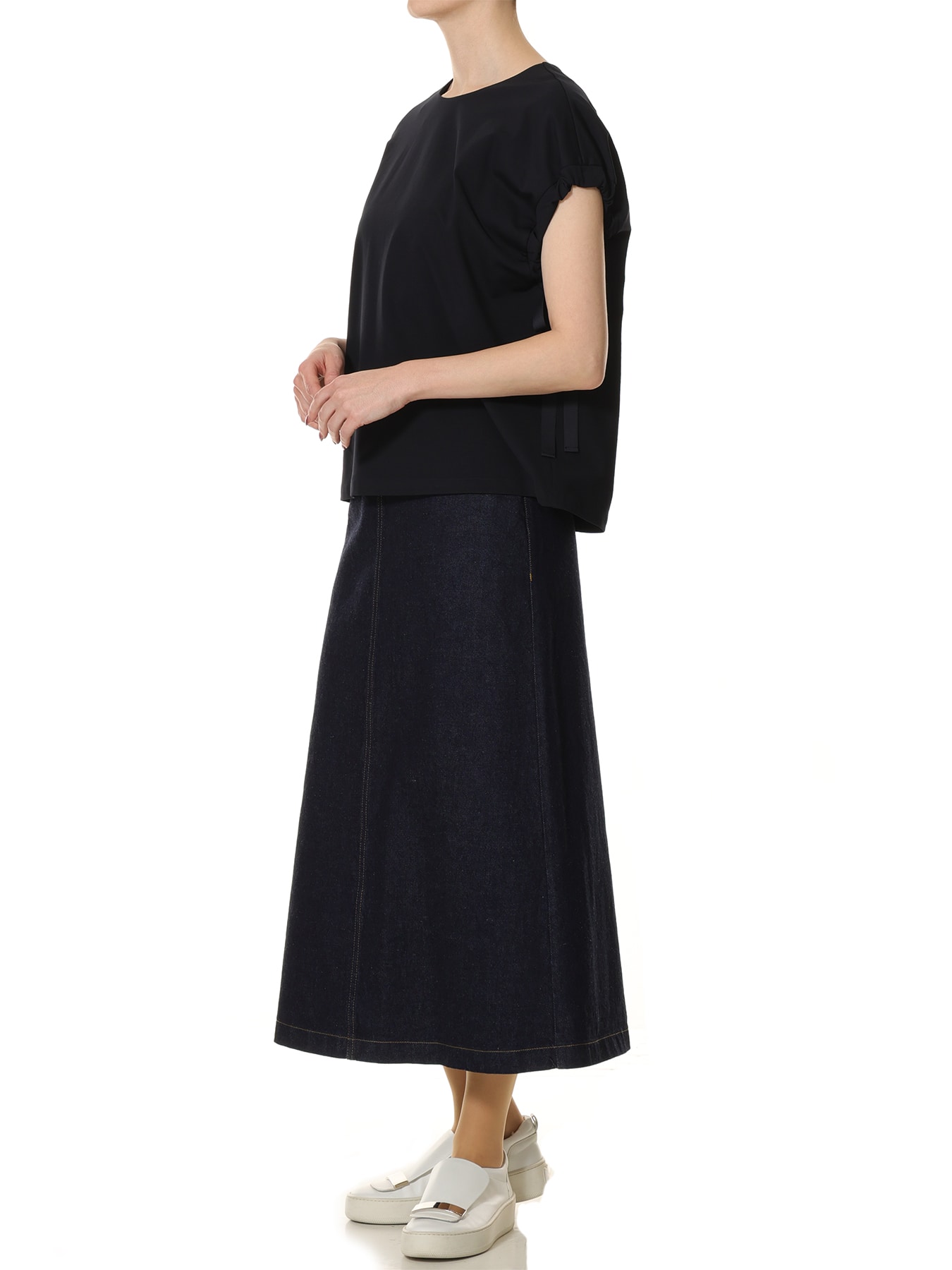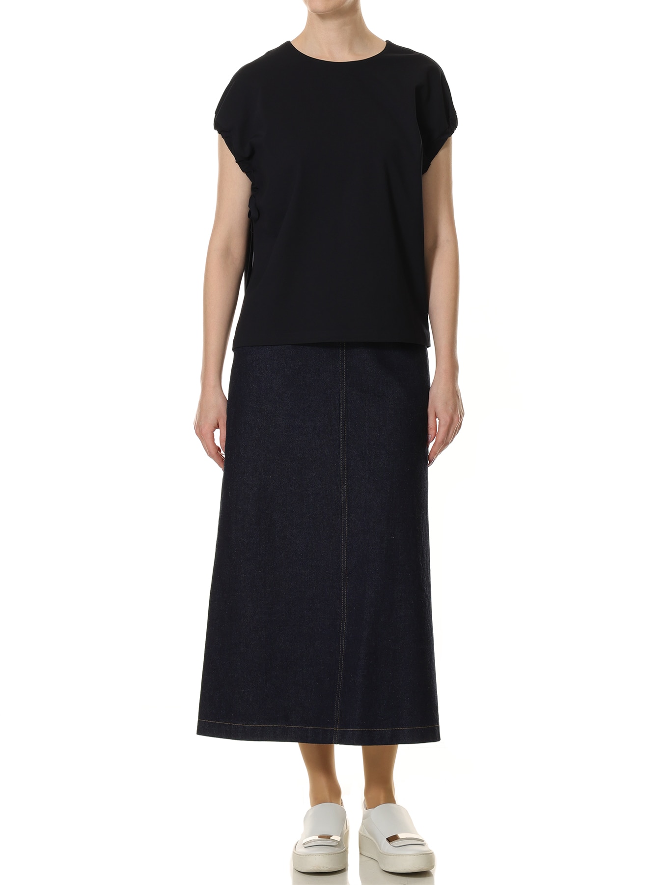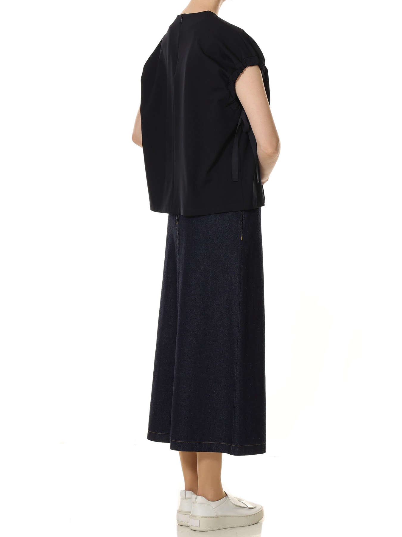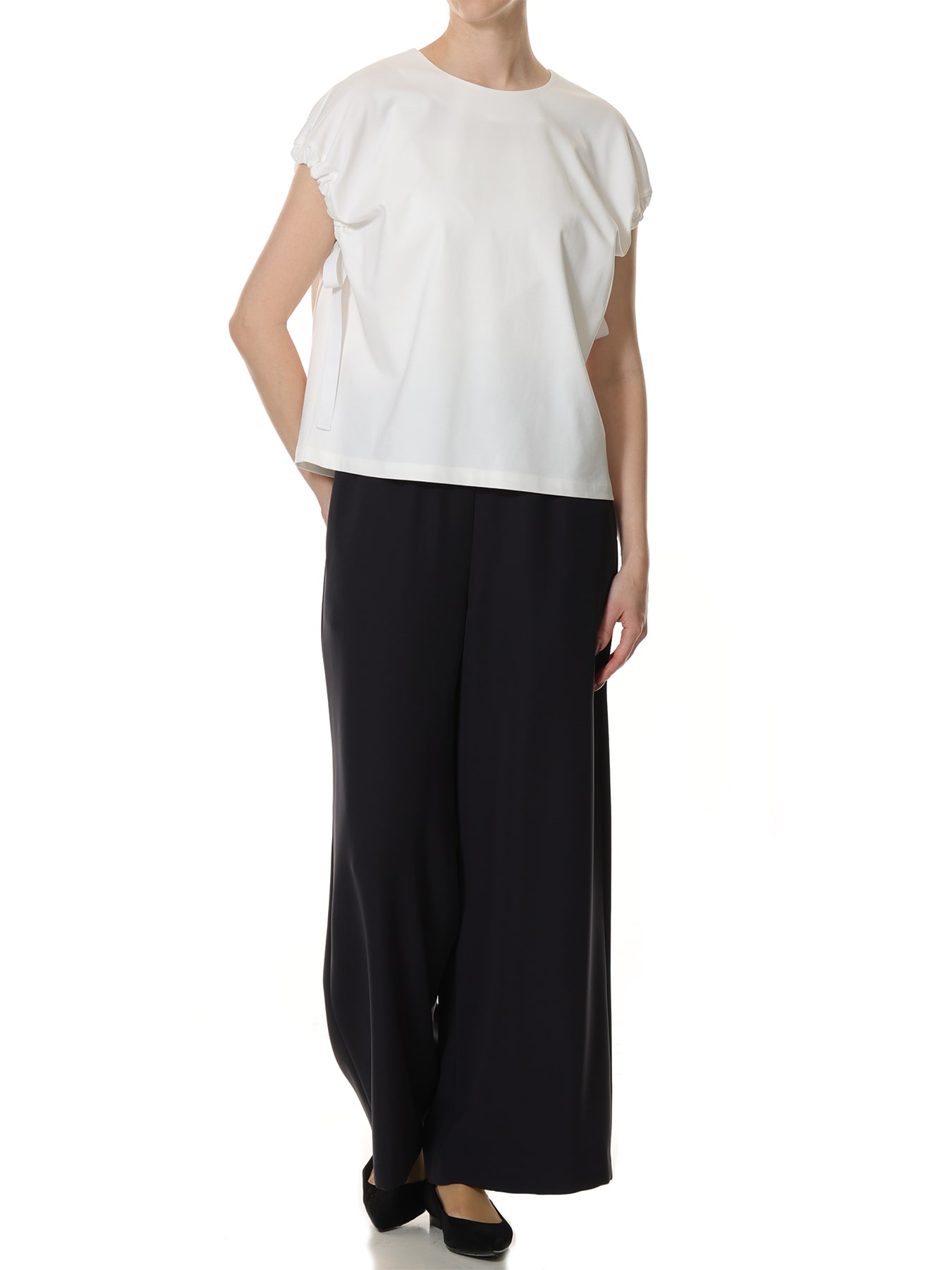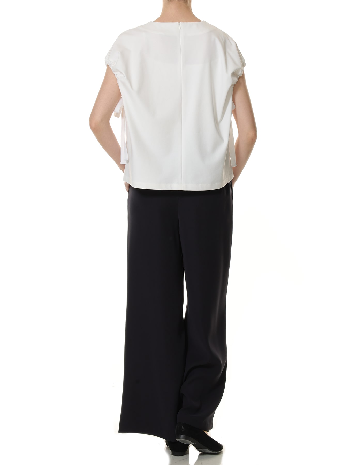 程よいハリと滑らかな表面感を備えた素材で仕立てたカットソー。ミニマルな身頃のデザインに、袖口へあしらったギャザーとリボンディテールがさりげないアクセントを添え、シンプルでありながらも存在感のある一着に仕上げました。リボンを通して寄せたギャザーが立体的なフォルムを生み出し、肩まわりにやわらかなニュアンスをプラス。ほどよくゆとりのあるシルエットがリラックス感を演出しながらも、洗練された雰囲気を保ち、大人のモードスタイルを完成させてくれます。パンツスタイルには、テーパードパンツやワイドパンツを合わせて、シャープで都会的な着こなしに。袖のデザインがさりげないポイントとなり、シンプルなパンツコーデに奥行きを与えてくれます。スカートスタイルには、タイトスカートを合わせてすっきりとしたモードなバランスに仕上げるのはもちろん、フレアスカートと合わせれば女性らしさを感じるエレガントなスタイルにも。合わせるボトムによって表情を変えながら、オンオフ問わず幅広いシーンで活躍する一着です。 ・ご家庭で手洗い可能 ・WHITEは透け感あり ・スチーム可能 ・バックコンシールファスナー開き ・ゆとりのあるフィット。通常サイズをお勧めします。 ・モデル身長171cm/バスト82cm/ウエスト60cm/ヒップ88cm/Mサイズ着用 【お問い合わせ品番】 WHITEのみ:U847-006 U847-005
