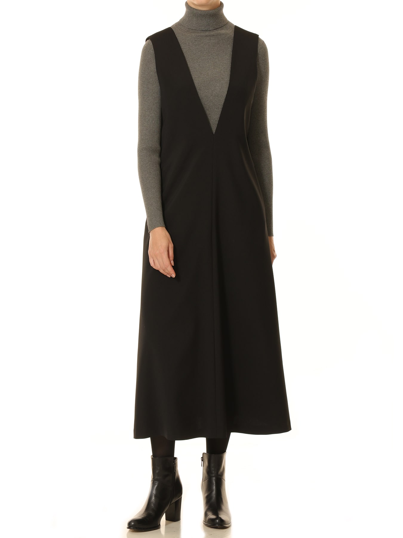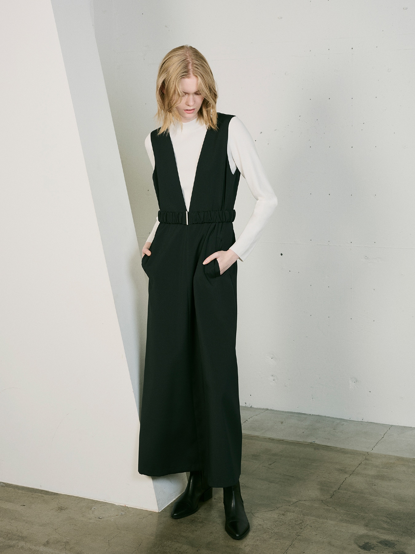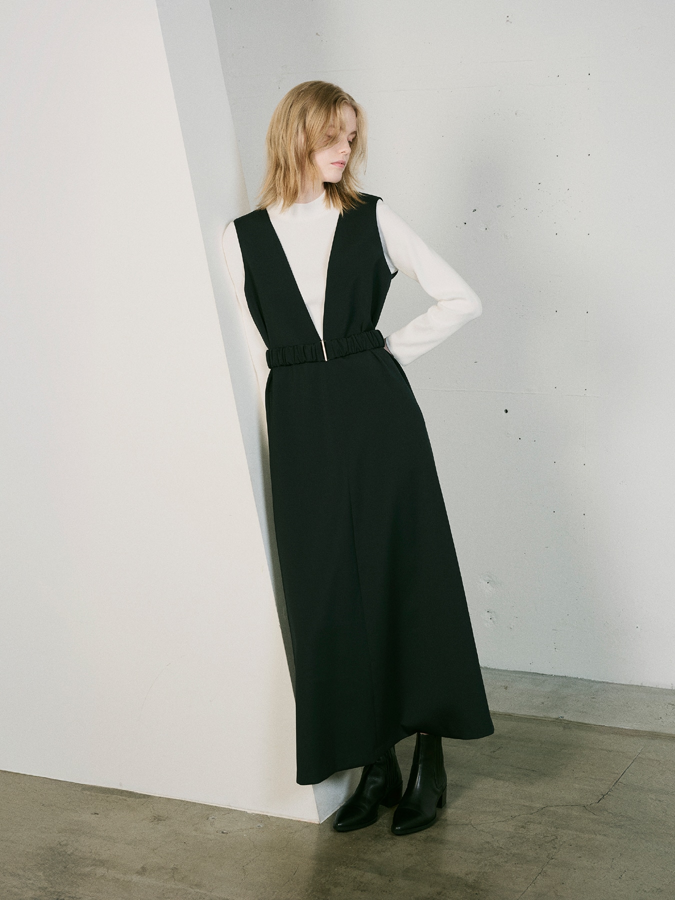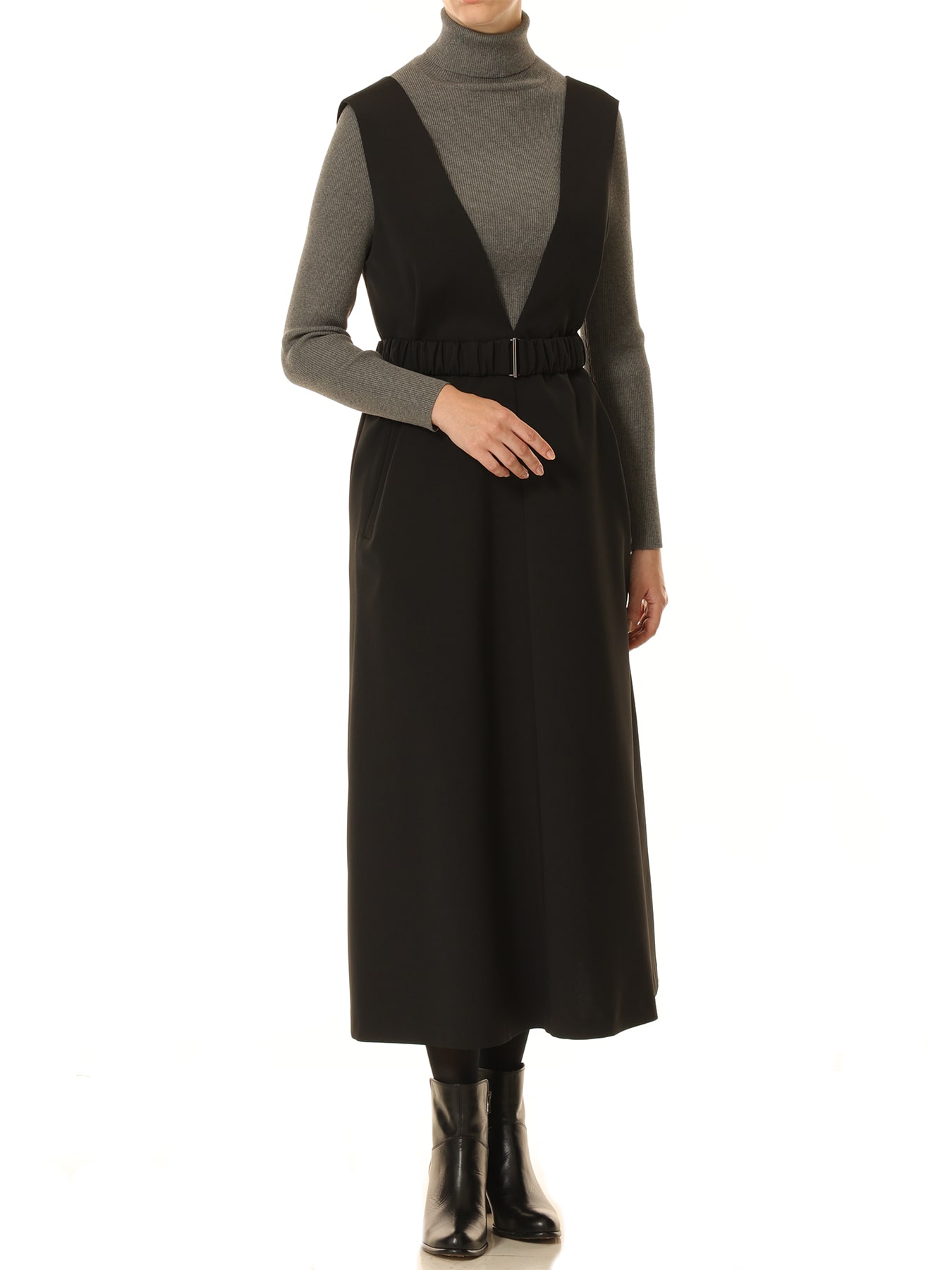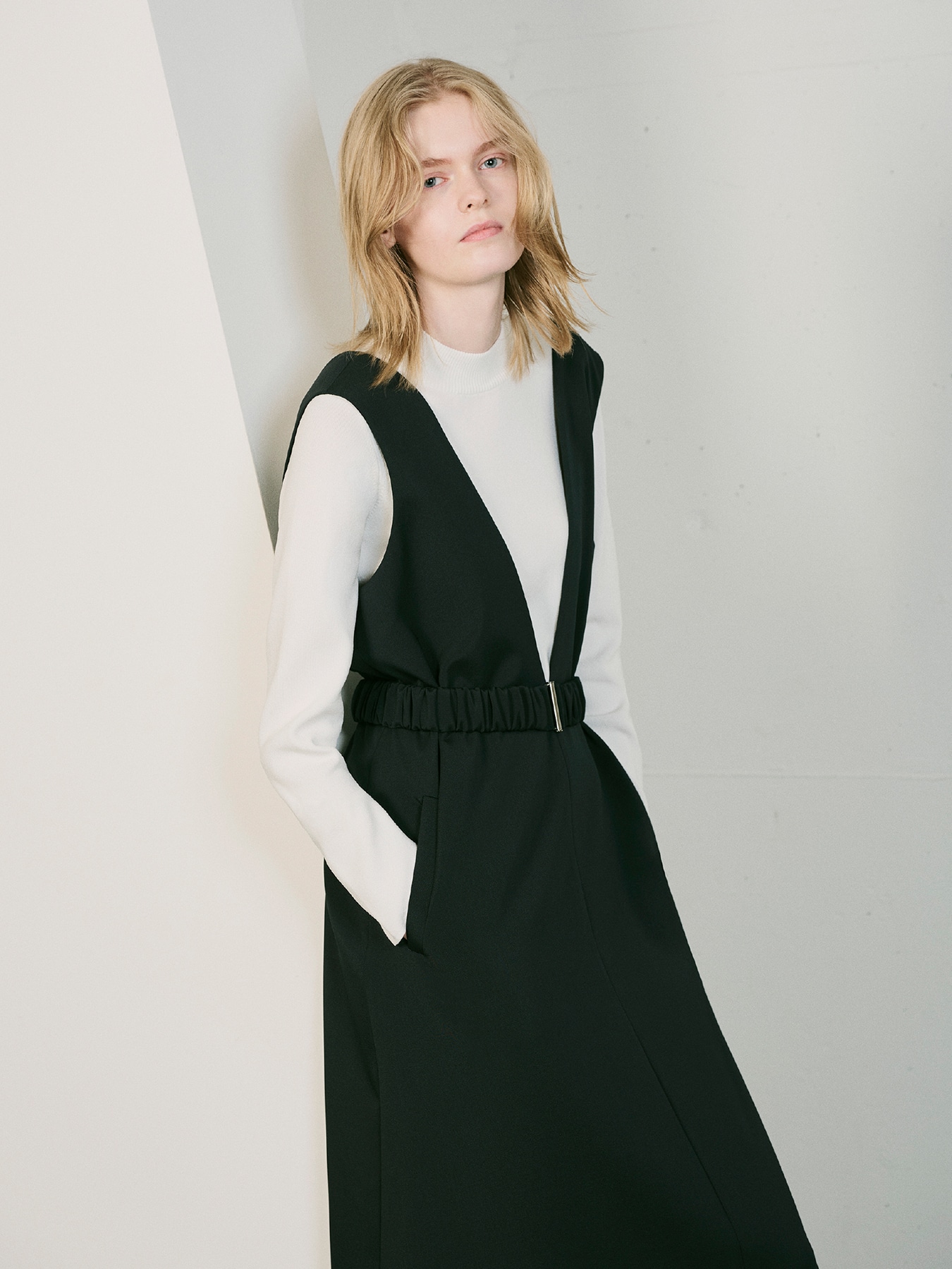 深いVネックがモードな印象を引き立てるジャンパースカート。美しい光沢感を持つダブルクロス素材を使用し、しなやかさと上品さを兼ね備えた仕上がりです。ウエストには取り外し可能な共布ゴムベルトを配し、シルエットにメリハリをプラス。インナーにタートルニットを合わせればシックに、ブラウスを重ねればフェミニンにと、着こなし次第で多彩な表情を楽しめます。デイリーからお出かけまで幅広く活躍し、モードとエレガントを兼ね備えた大人のスタイルを叶える一枚です。 ・ご家庭で手洗い可能 ・ポケットあり ・ファスナー開きなし ・ジャストフィット。通常サイズをお勧めします。 【お問い合わせ品番】 U946-001