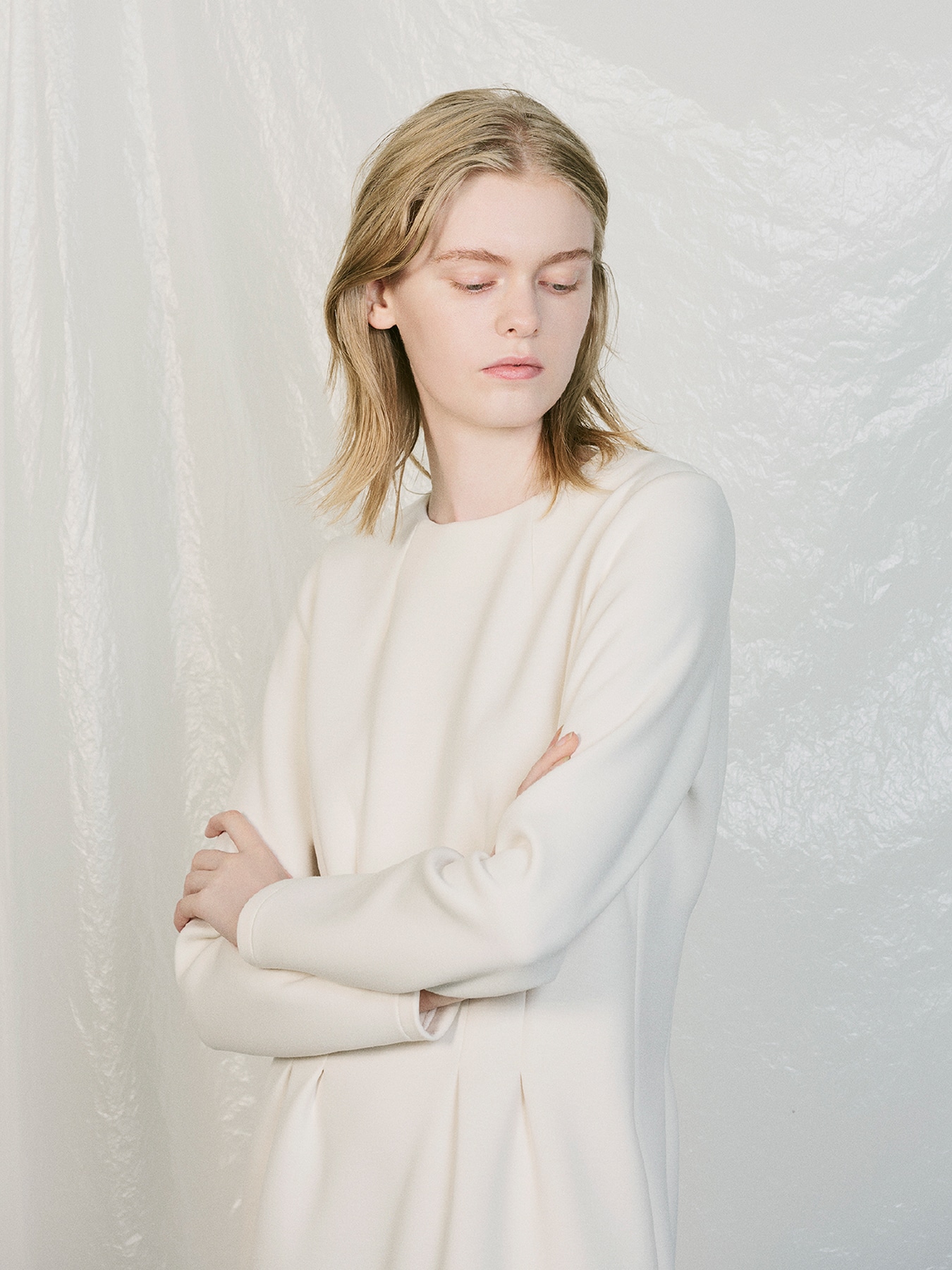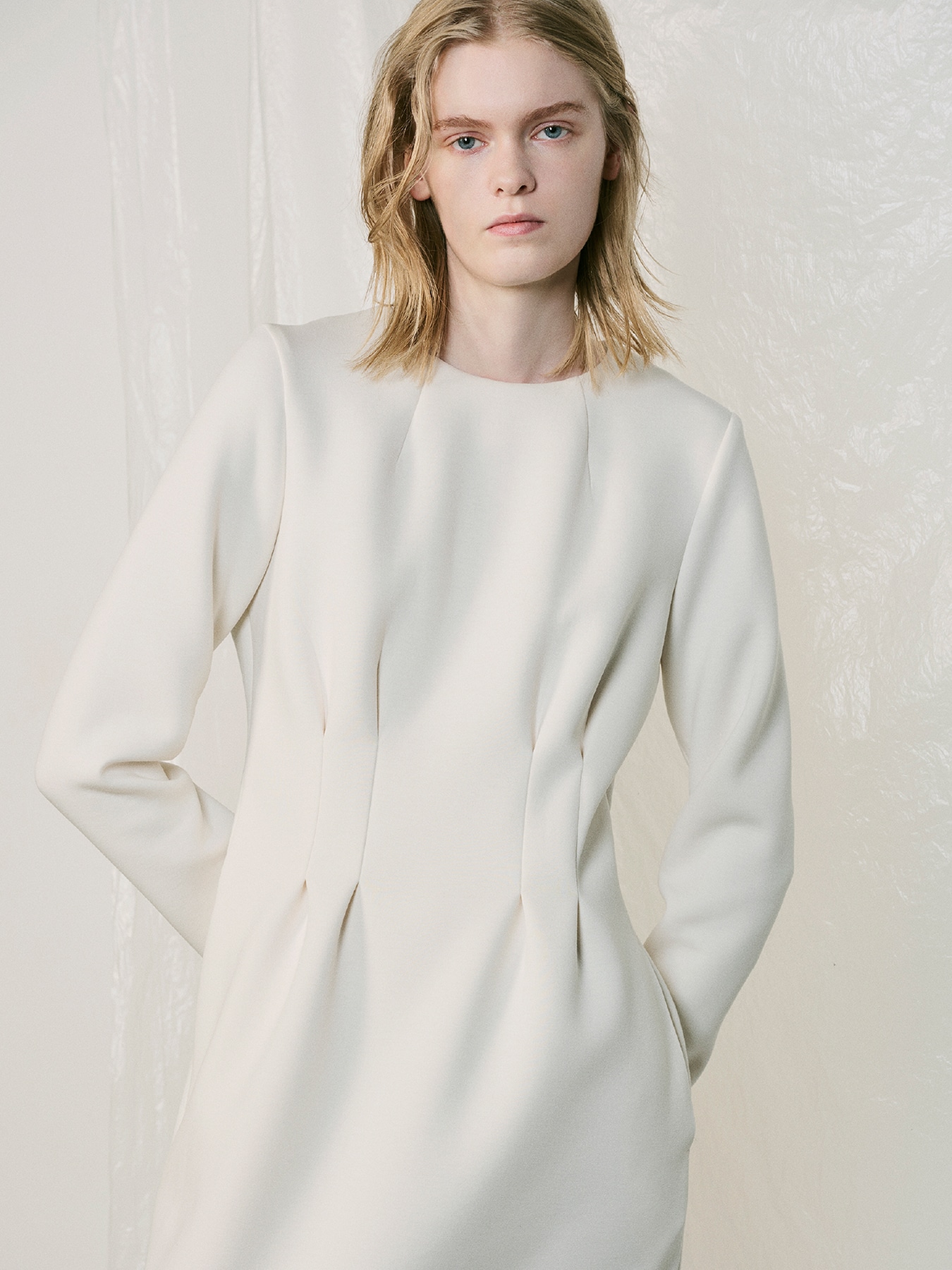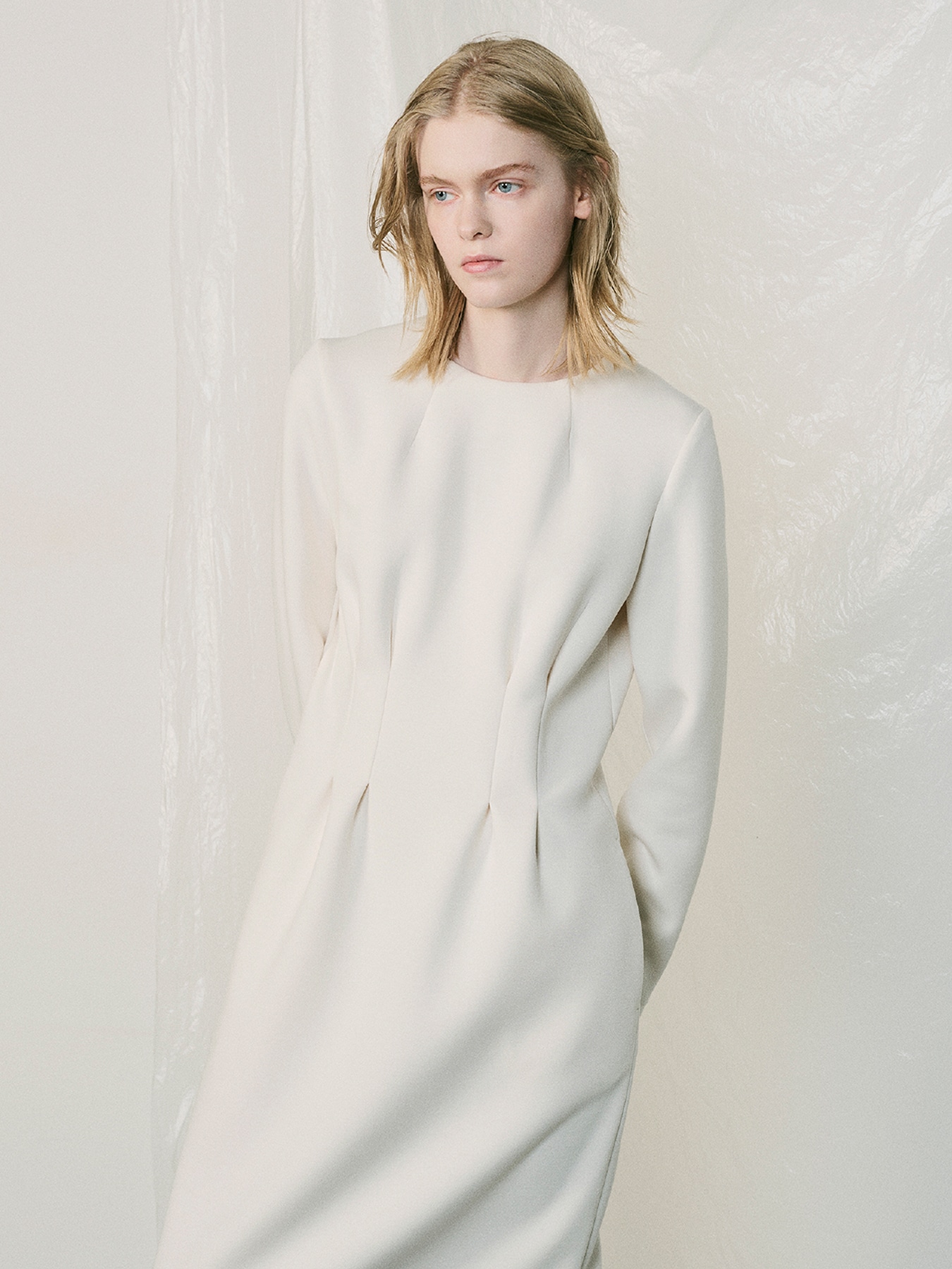 ウエストに施されたタックデザインがアクセントポイントになった長袖ワンピース。スポンジを挟み込んだ様に嵩高で、かつ軽さが特徴のダンボールニット素材を使用し、軽量感とストレッチ性に優れ着心地の良さは抜群。ウエストデザインを効かせることでくびれが生まれ、スカート部分はタイトにデザインすることでスタイルアップしてお召いただける一着です。ロング丈は大人らしい雰囲気を醸し、バックにはベンツを施すことで足捌き良くお召しいただけます。エフォートレスな雰囲気を纏いながらも一枚ででコーディネートが完成し、お出かけにも重宝いただけるワンピースです。 ・ご家庭で手洗い可能 ・両脇シームポケットあり ・IVORYは透け感あり ・スチーム可能 ・ややゆとりのあるフィット。通常サイズをお勧めします。 【お問い合わせ品番】 U946-003